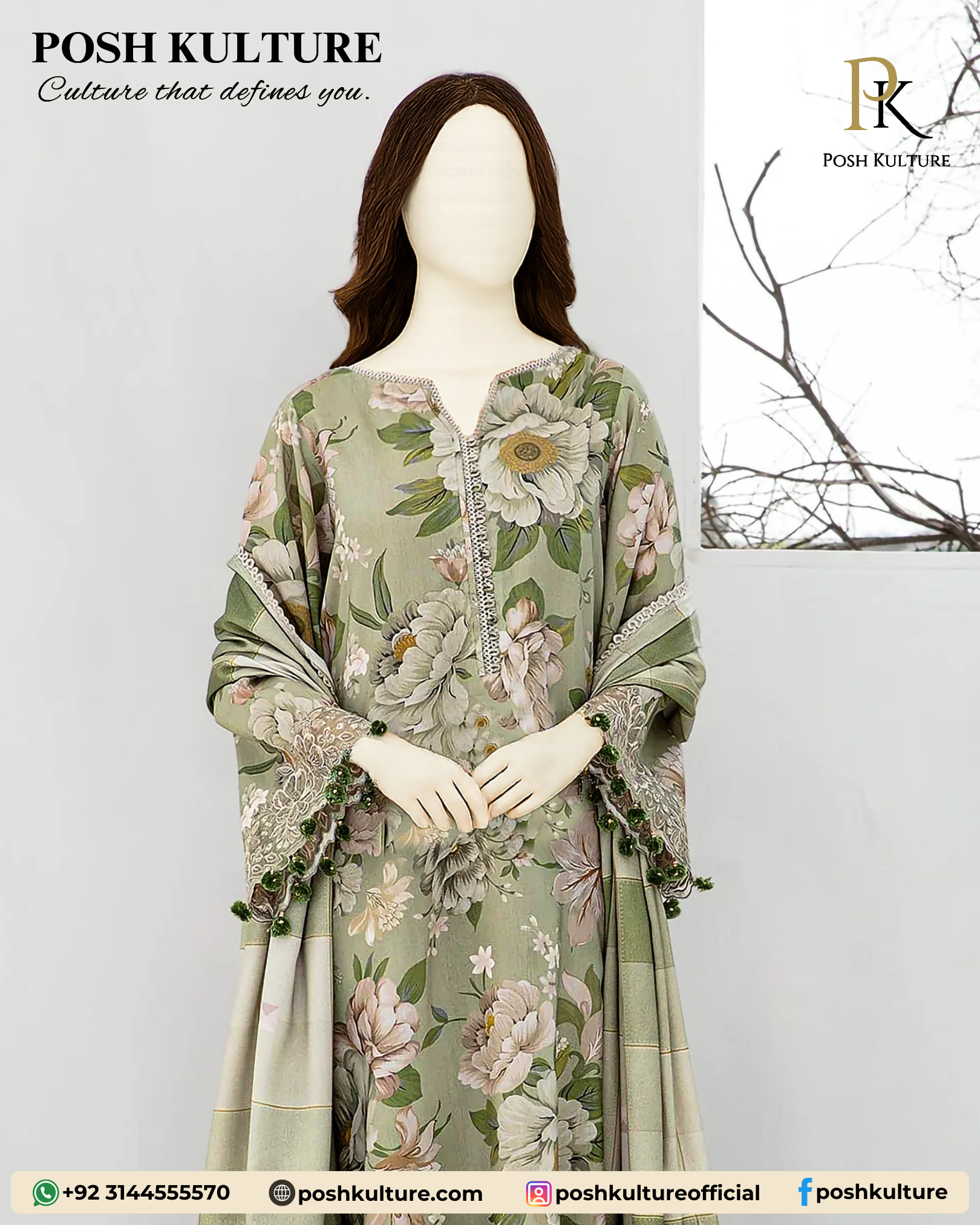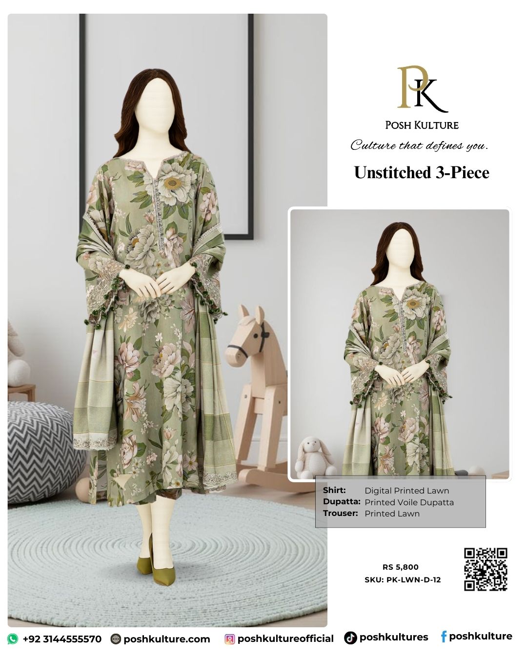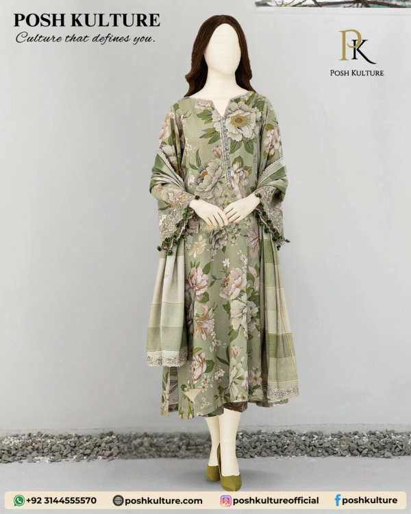 Posh Kulture luxury 3PC lawn collection! This stunning ensemble features a digitally printed shirt with matching sleeves and back, a digital printed trouser, and a beautifully crafted luxury voile lawn dupatta. Perfect for adding elegance to your summer wardrobe.