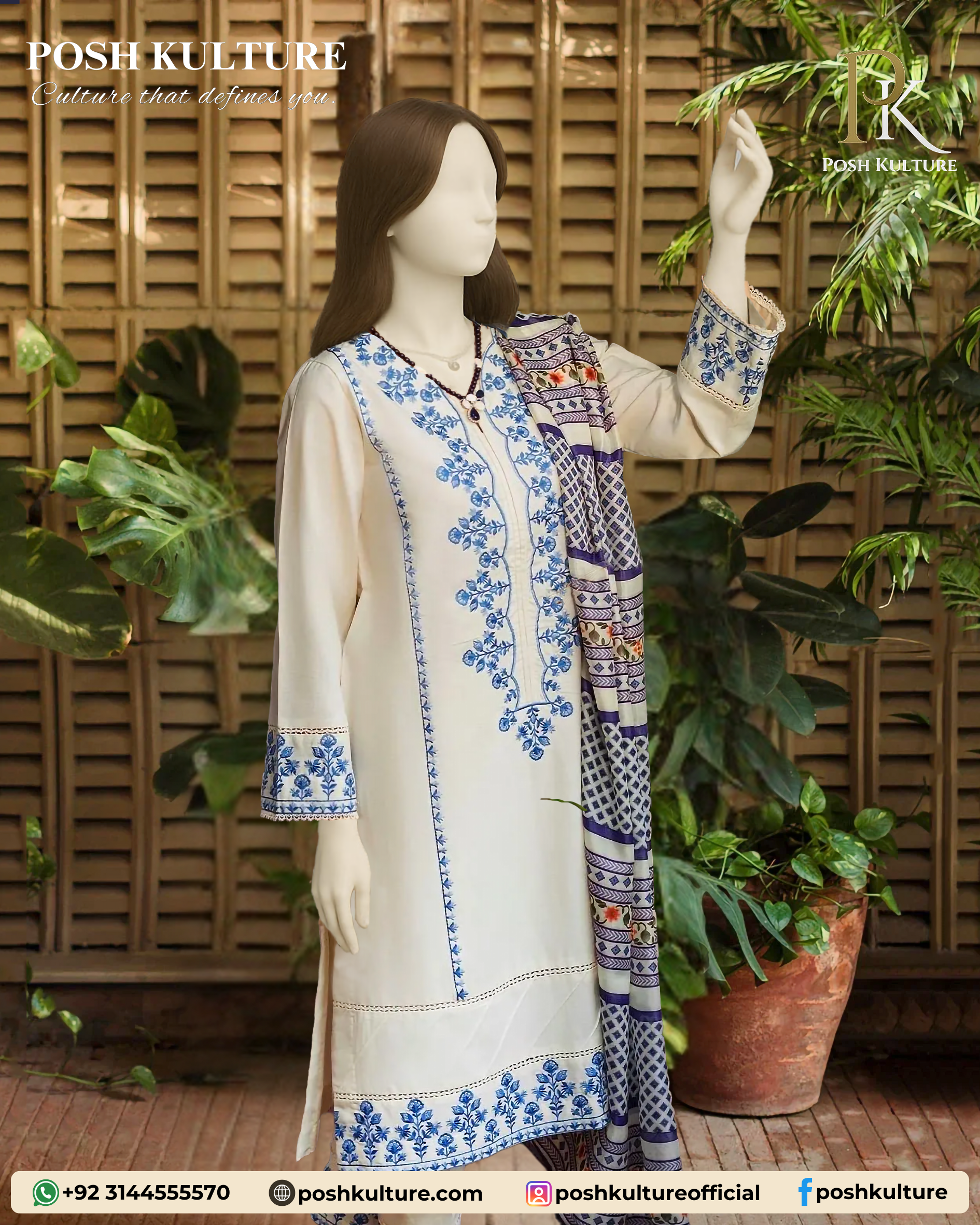 Celebrate elegance with this 3-piece lawn outfit featuring a fully embroidered front, intricate embroidery on sleeves and daman patch, paired with a soft voile diamond-printed dupatta and plain dyed back & trouser. A timeless festive look, perfect for your Eid moments.