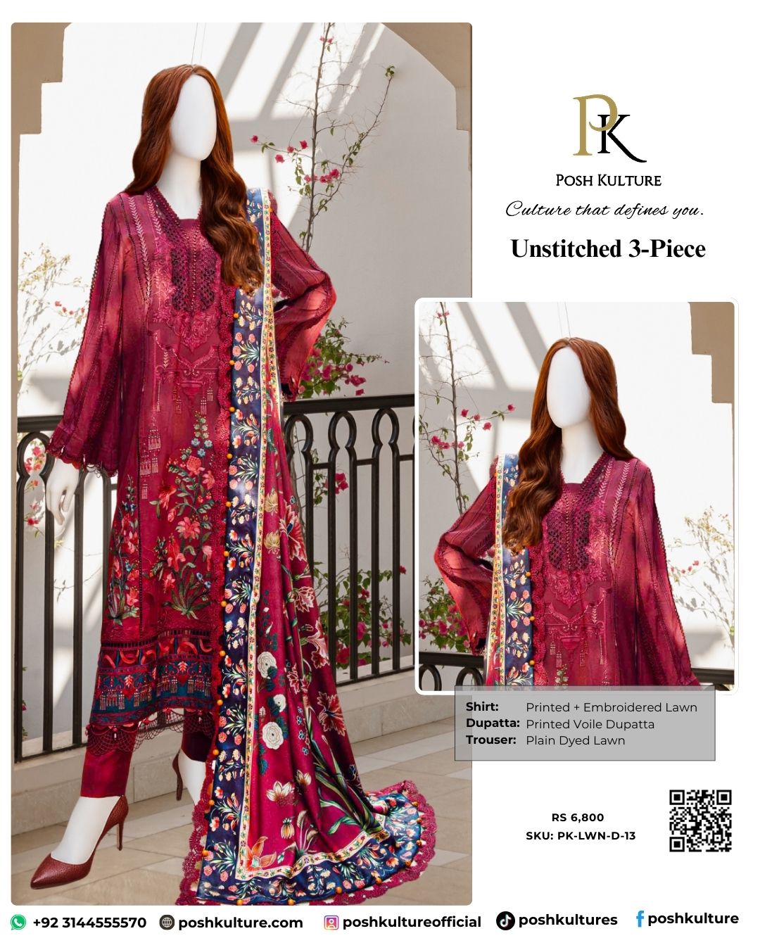Bring grace to your everyday look with Posh Kulture’s beautifully crafted 3PC Lawn set. It features a heavily embroidered front, sleeves, and daman, paired with a plain trouser. The outfit is completed with a digitally printed Voil Diamond dupatta for a stylish finish.