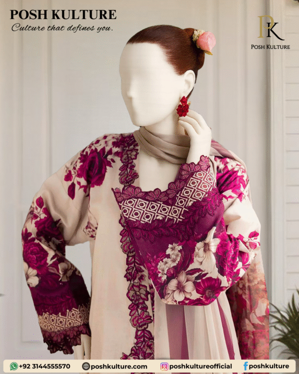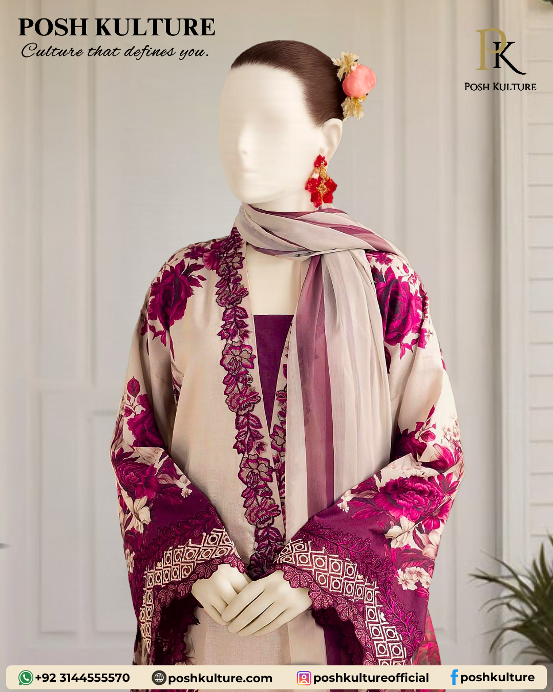 Feel beautiful and comfortable in Posh Kulture’s 3-piece lawn suit, featuring digitally printed lawn for the front, back, and sleeves. The look is enhanced with a beautifully embroidered necklace and patch, along with delicate sleeve embroidery. Paired with a stunning digital-printed chiffon dupatta and coordinated printed trousers, this ensemble is the perfect blend of style and comfort for the season.