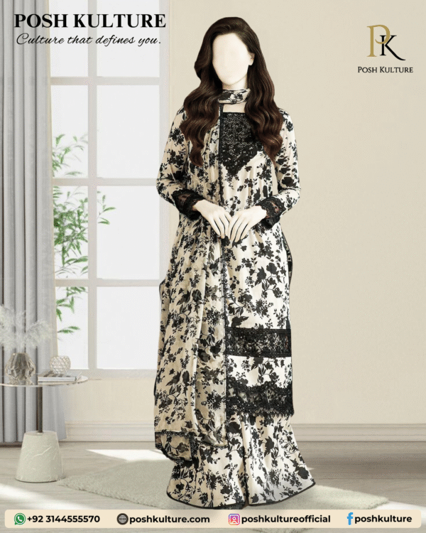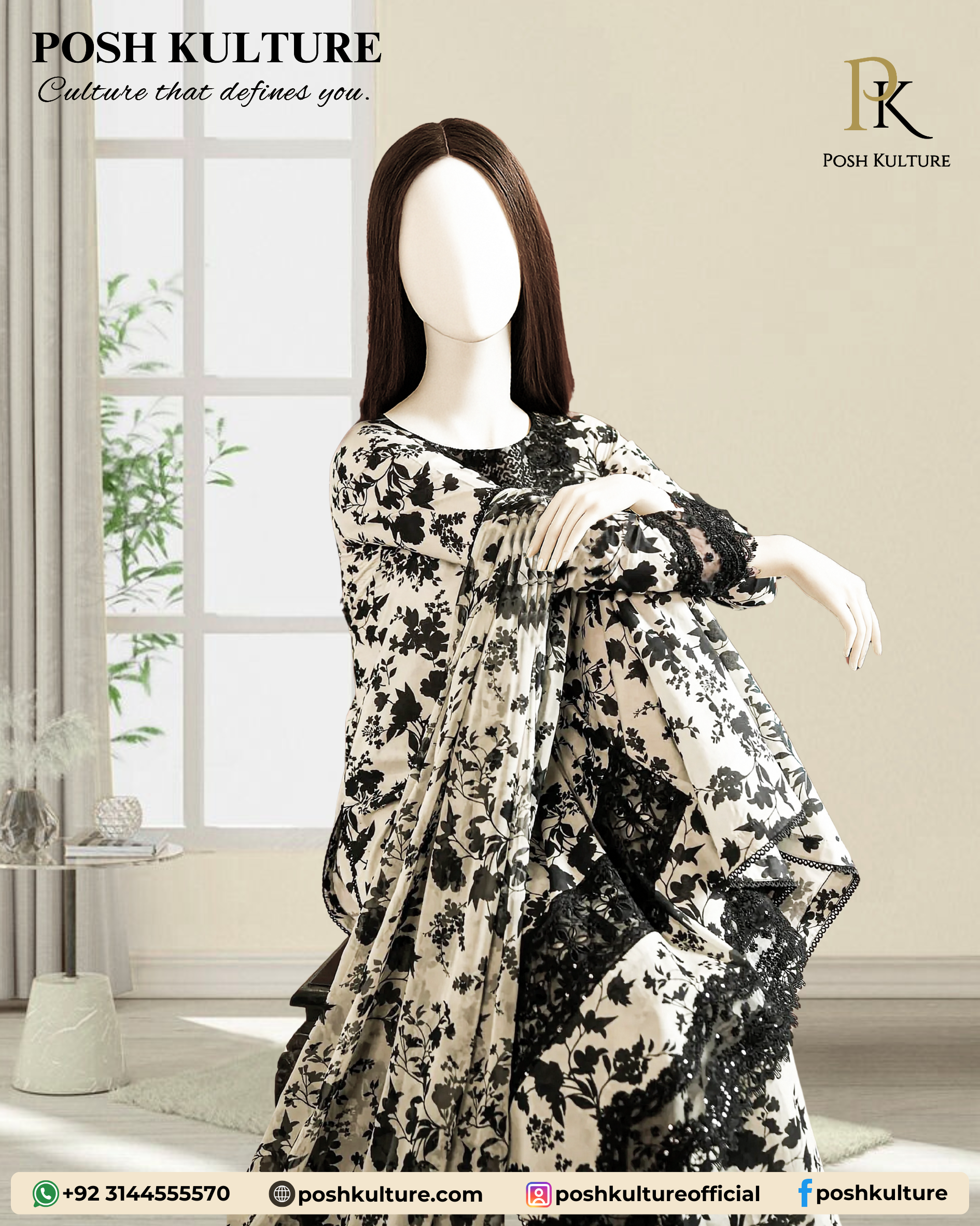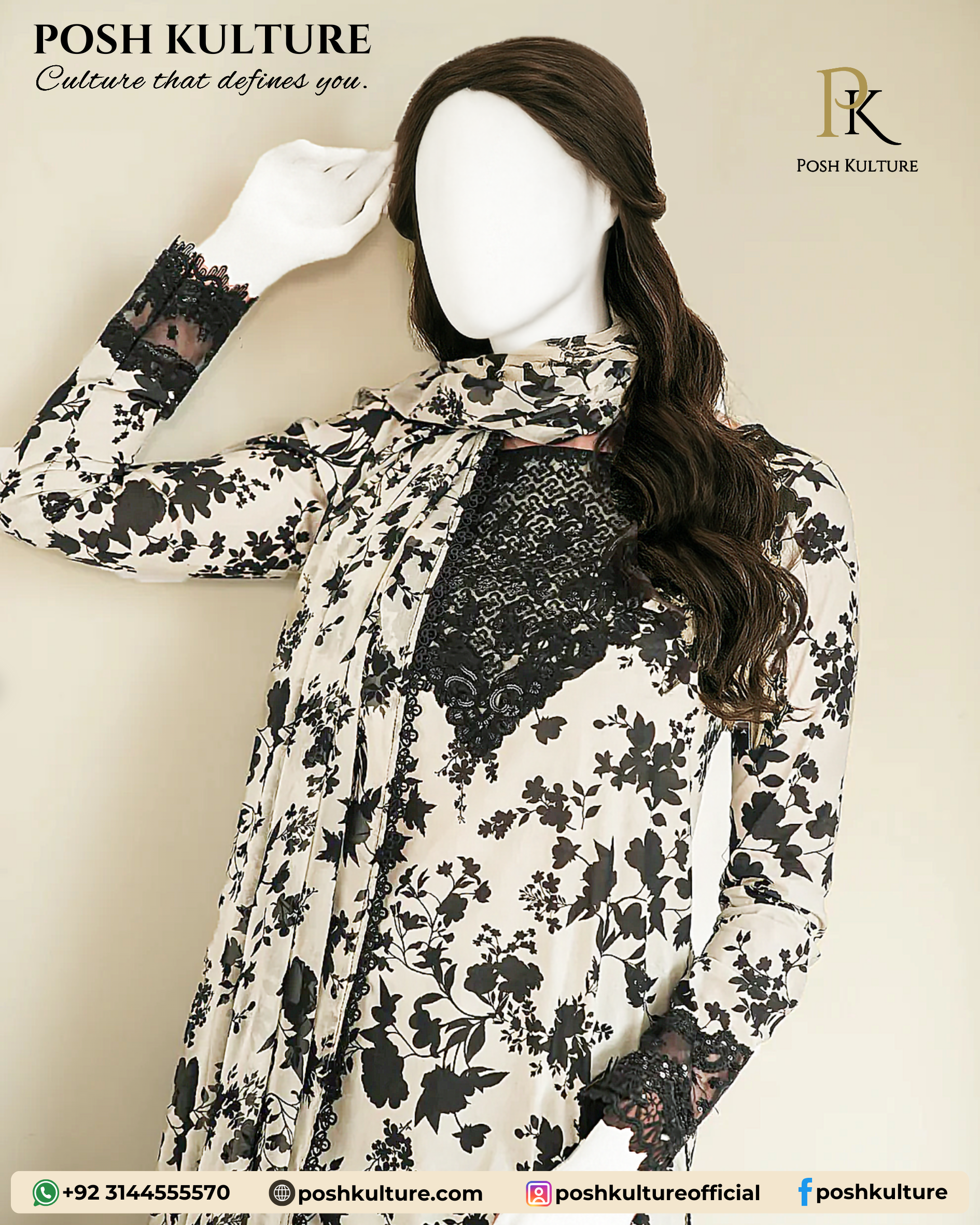 This elegant 3PC unstitched suit features a luxury lawn printed front with embroidered daman, neckline, and sleeves patch; a printed back and trouser; and a soft Swiss voile printed dupatta. Perfect for effortless casual style with a touch of grace.