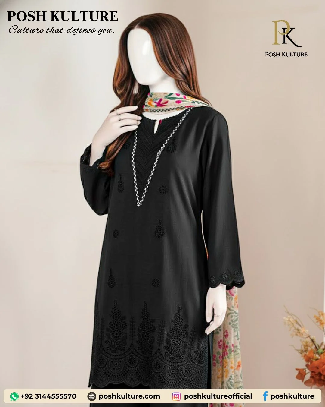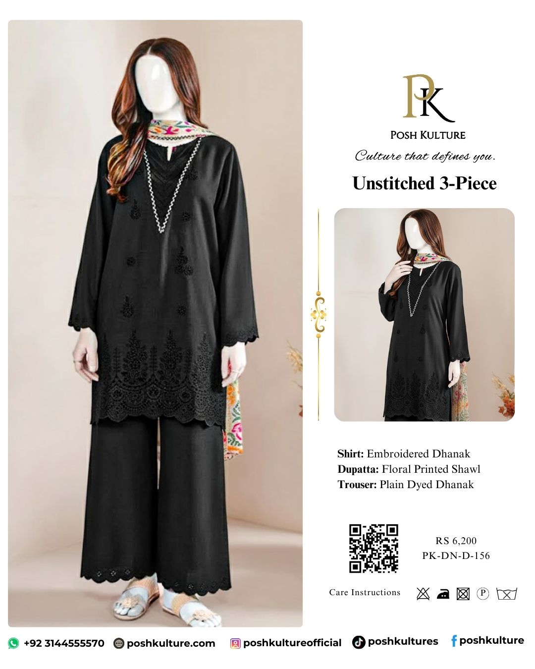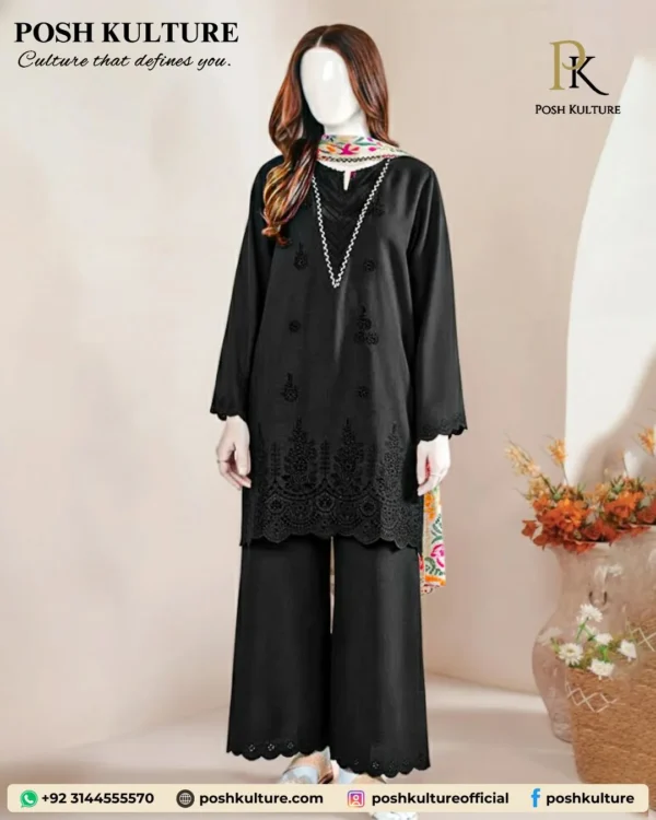 Black is power! Make a powerful statement with our Sapphire Premium Luxury Dhanak Suit in elegant Black. This 3-piece ensemble boasts exquisite full embroidery and signature Chicken Kari on the daman, perfectly complemented by a vibrant, floral-printed shawl. Your most essential winter look.