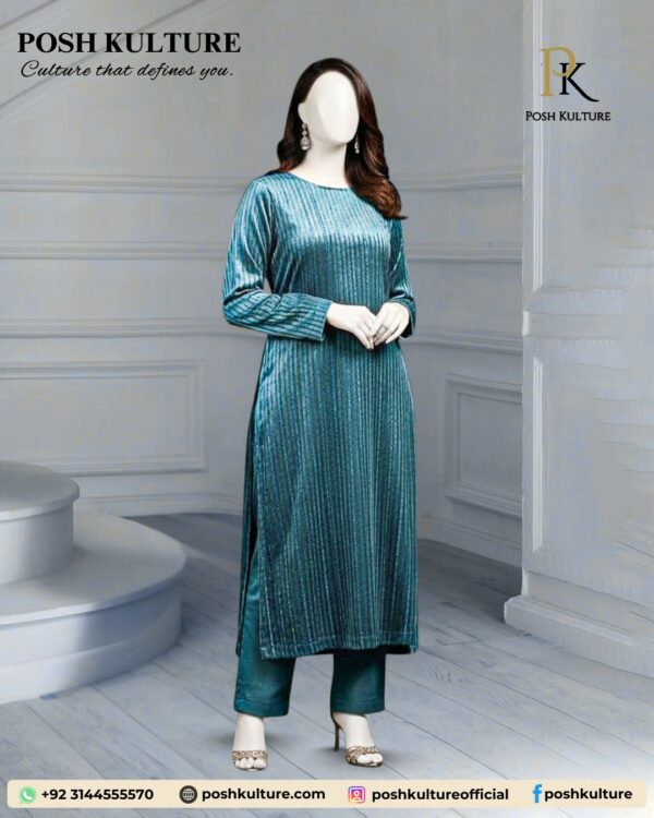 This trending 2PC suit features a gorgeous Teal Blue Chamki lining Velvet Shirt (sleeves/back included) and a plain trouser. Generous fabric cut: 3 Ghaz total (56-inch araz).