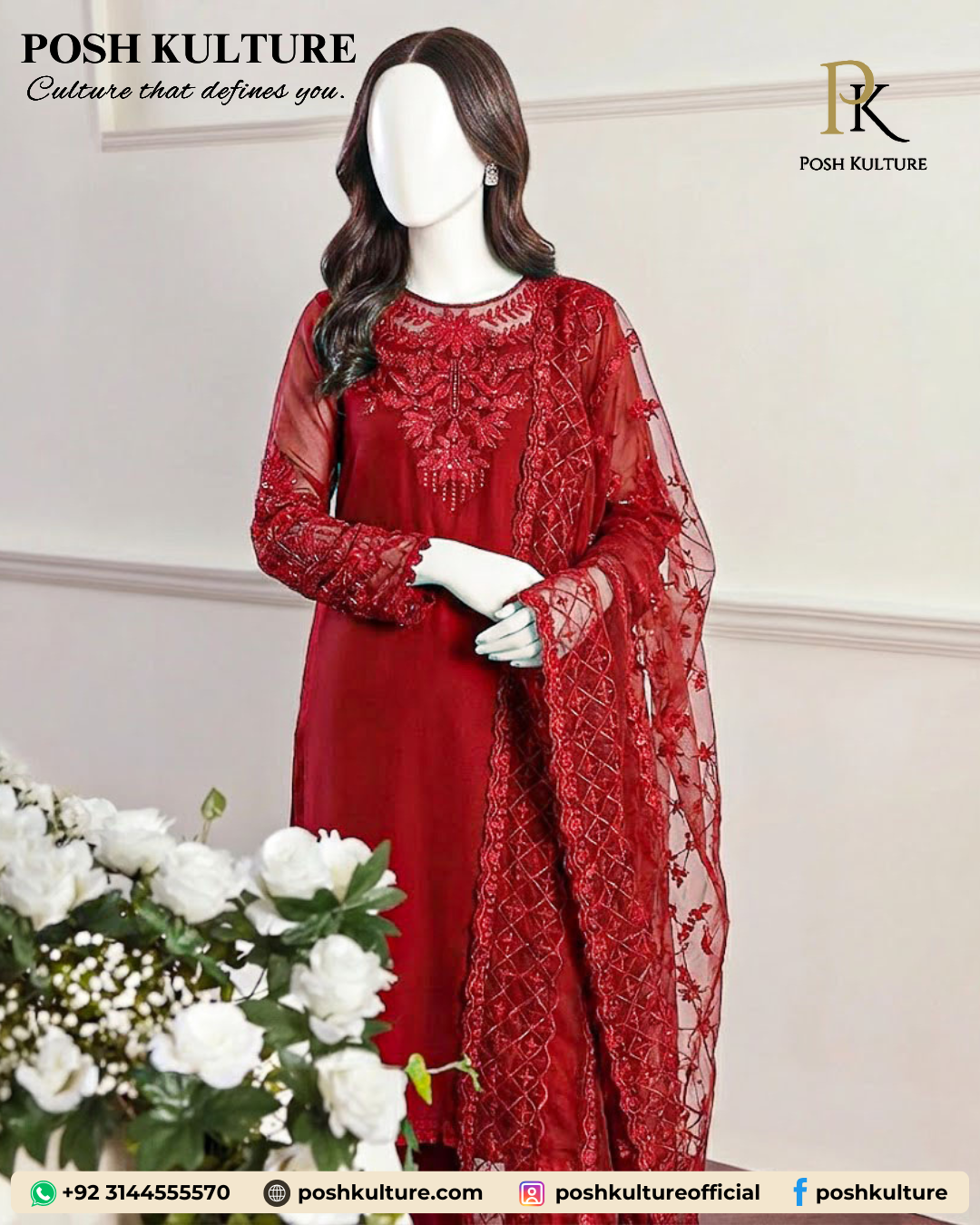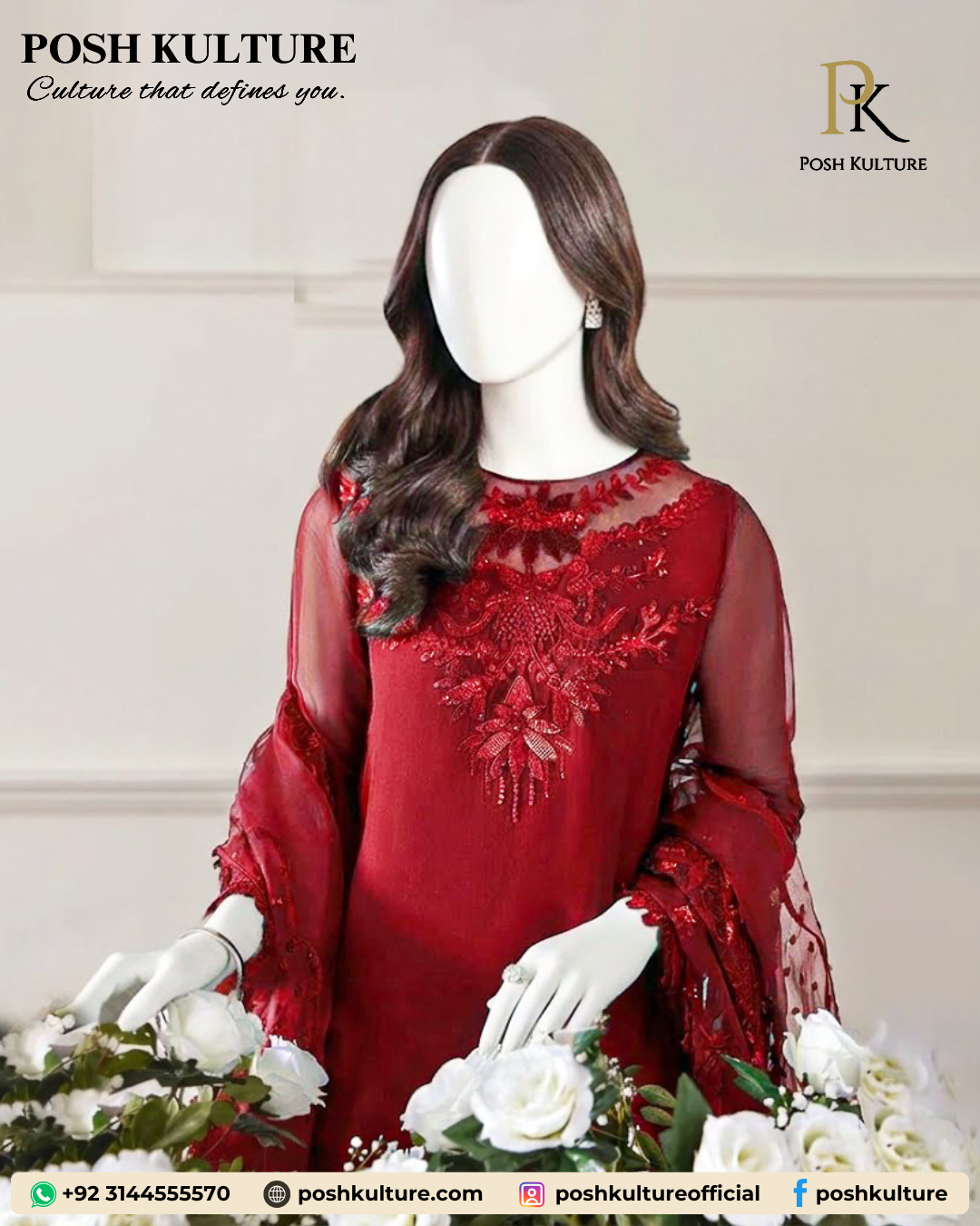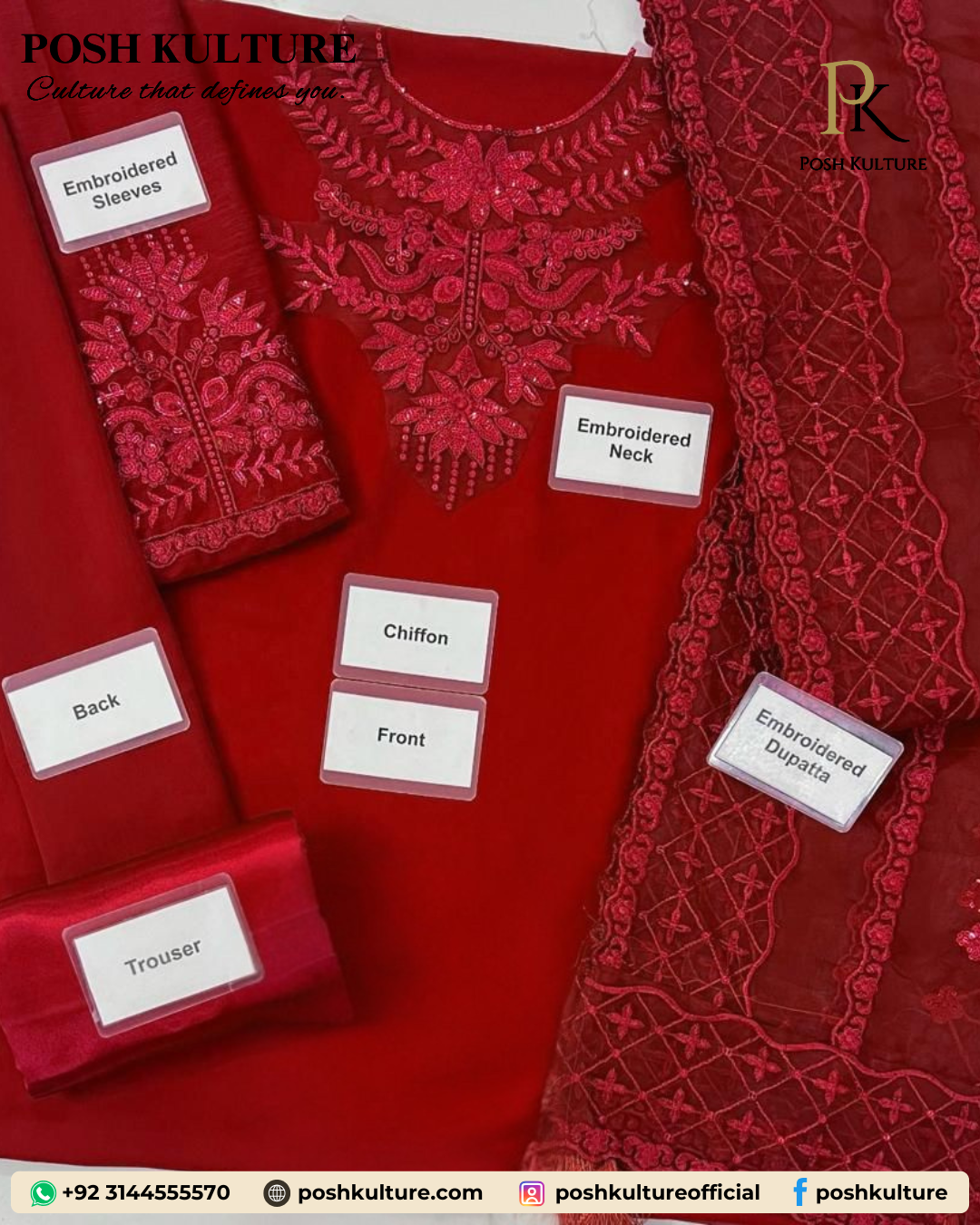 Posh Kulture presents this vibrant crimson red masterpiece in premium chiffon. The design features a heavy, luxury embroidered neckline paired with shimmering sequence work sleeves. A beautifully embroidered organza dupatta with hanging tassels completes this regal wedding look.