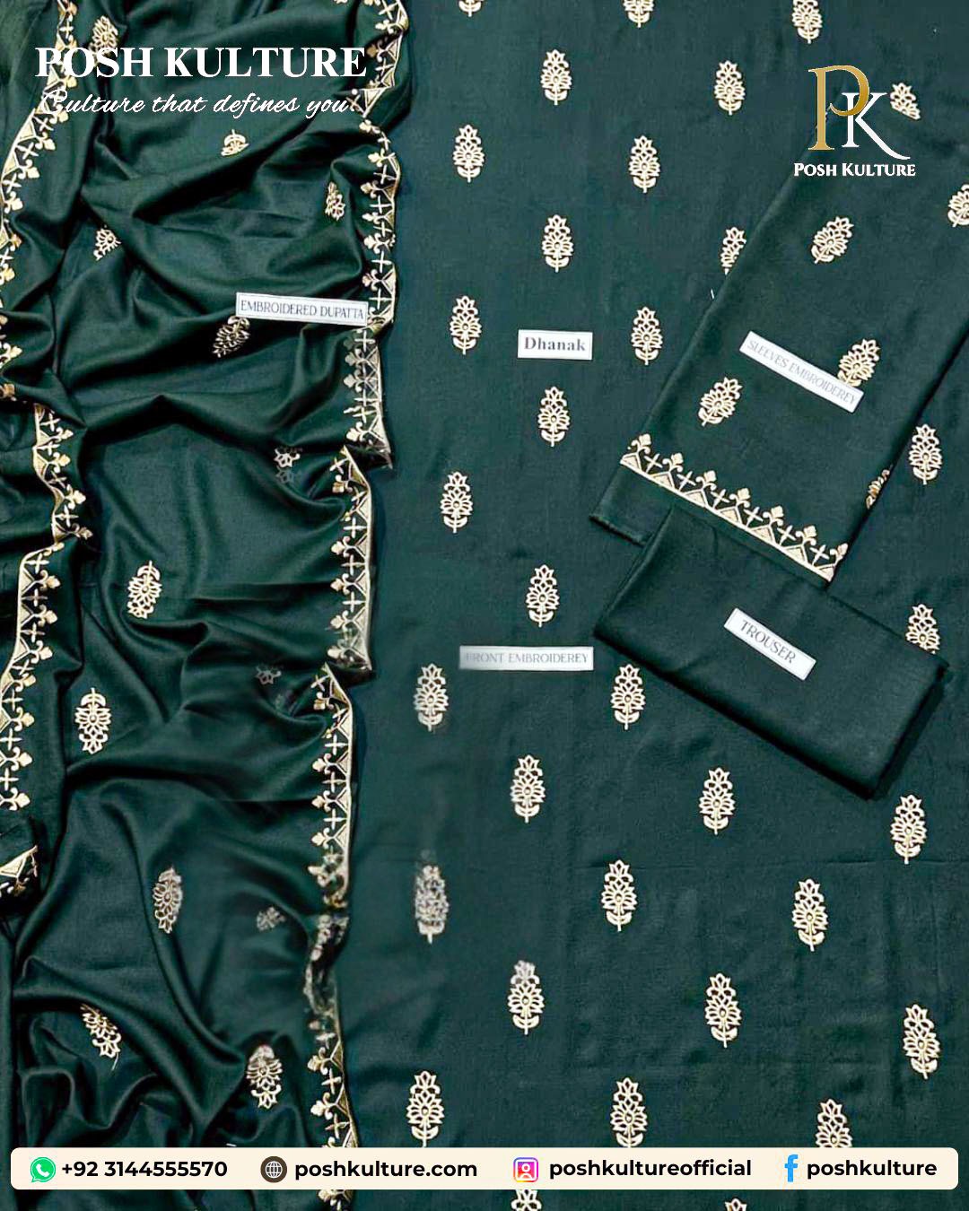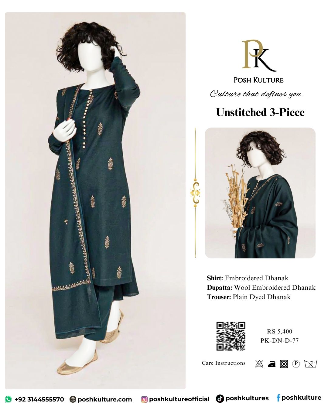 Embrace elegance this season with our dark teal luxury Dhanak suit, part of the Winter Collection 2025. Designed with a full heavy embroidered shirt, embroidered sleeves, and a premium soft wool Dhanak embroidered shawl, it offers warmth and sophistication in one stunning ensemble.