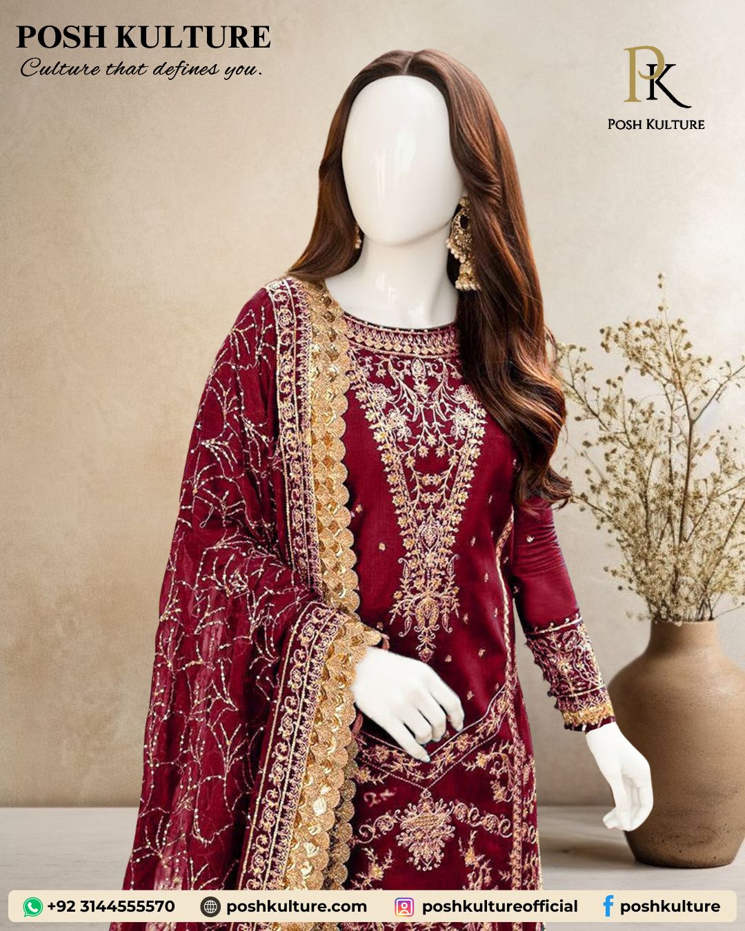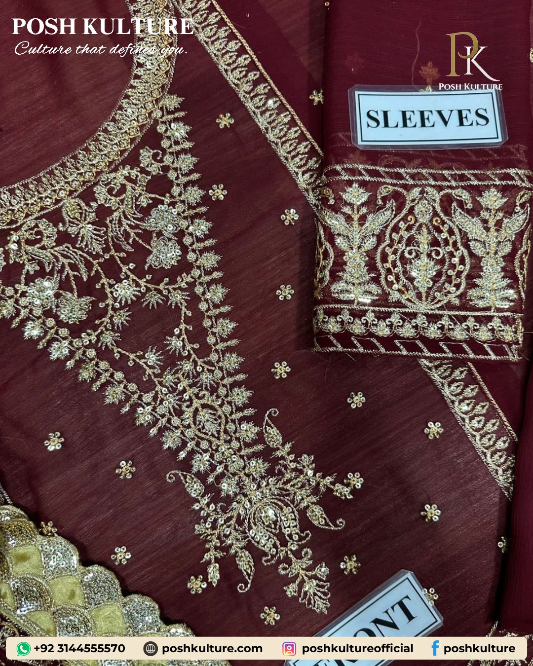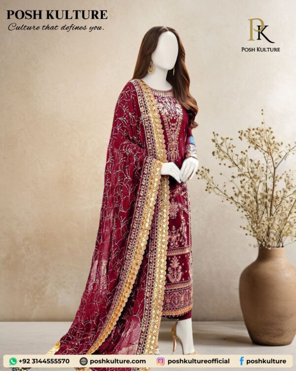 Ready for the spotlight! Shop this luxurious deep berry chiffon suit featuring head-to-toe heavy embroidery and stunning gold accents. The dupatta has an exquisite 4-sided border for maximum glamour. Don’t miss this—shop the luxury collection now! ✨