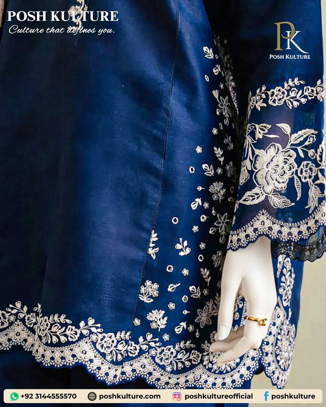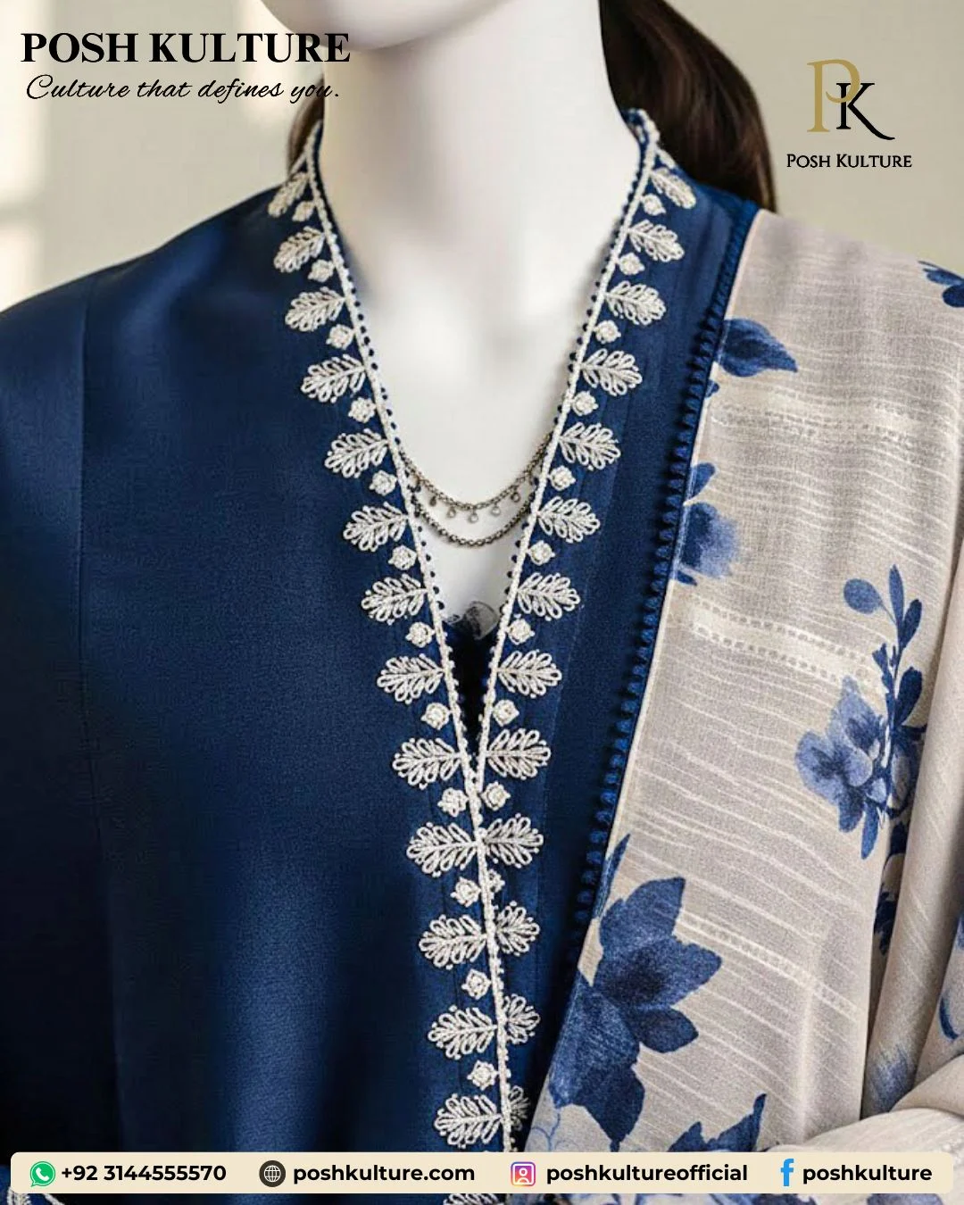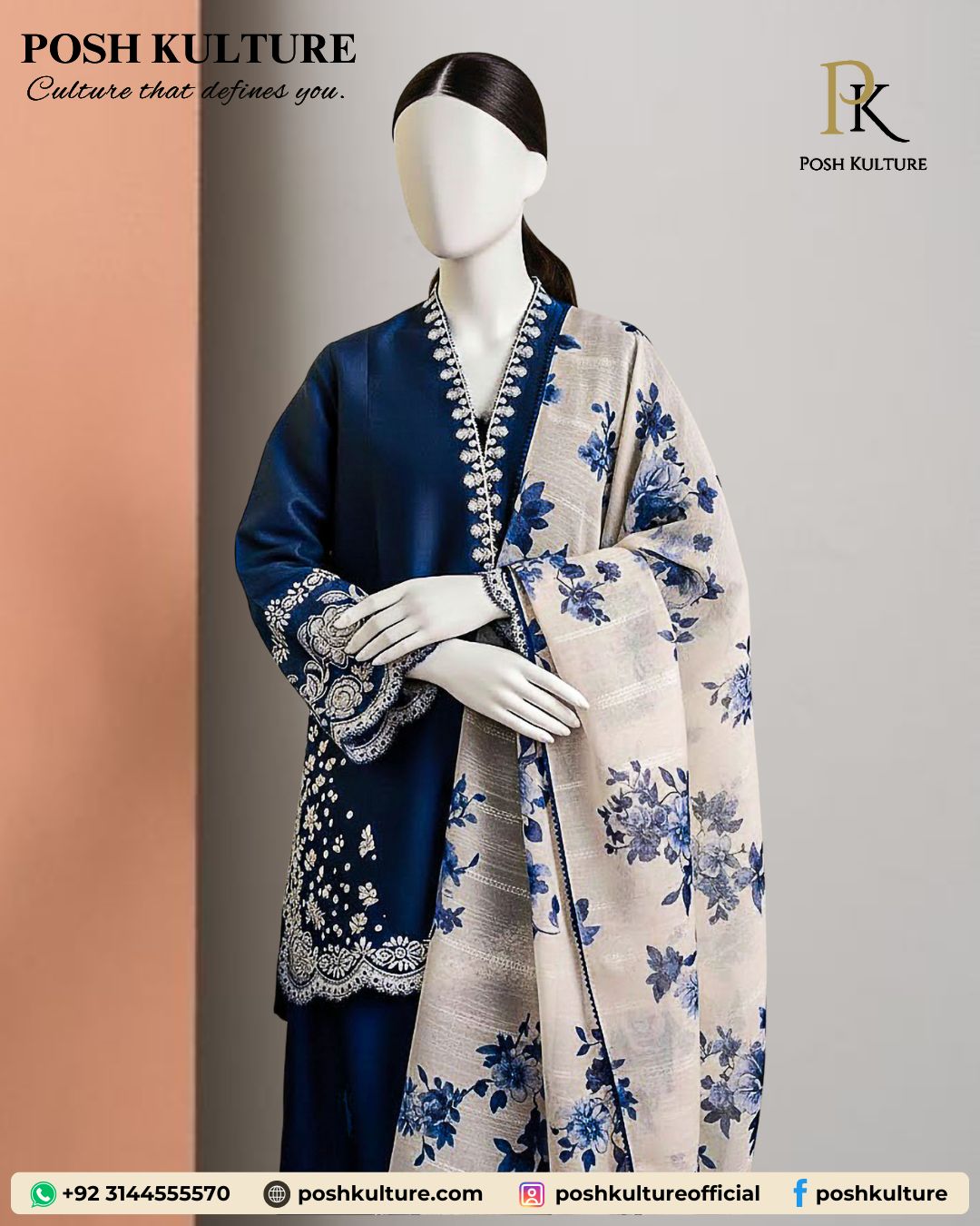 Command the room! Our Sapphire Premium Luxury Dhanak Suit in Deep Navy Blue is a masterpiece of winter elegance. Featuring exquisite full embroidery and standout detailing on the daman, this 3-piece set is flawlessly paired with a vibrant, floral-printed shawl. Your secret weapon for chic winter events.