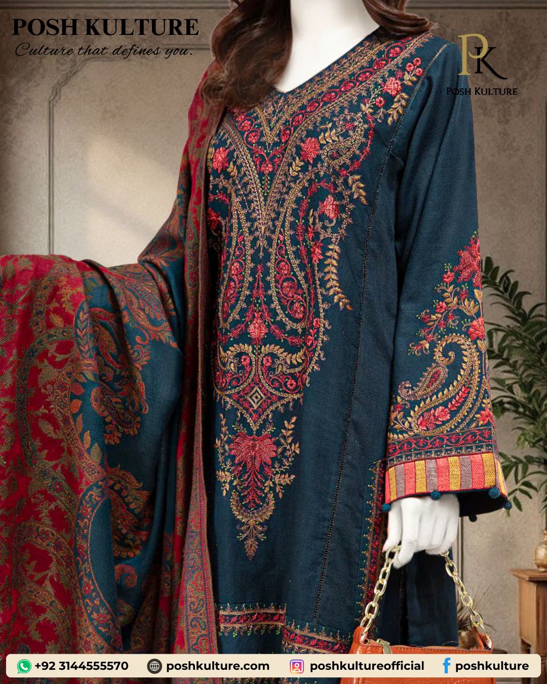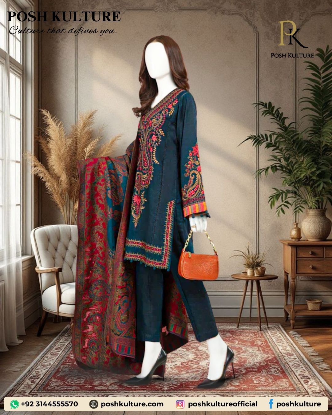 Tags: Deep Teal Suit, Dhanak Embroidery, Luxury Wool Shawl