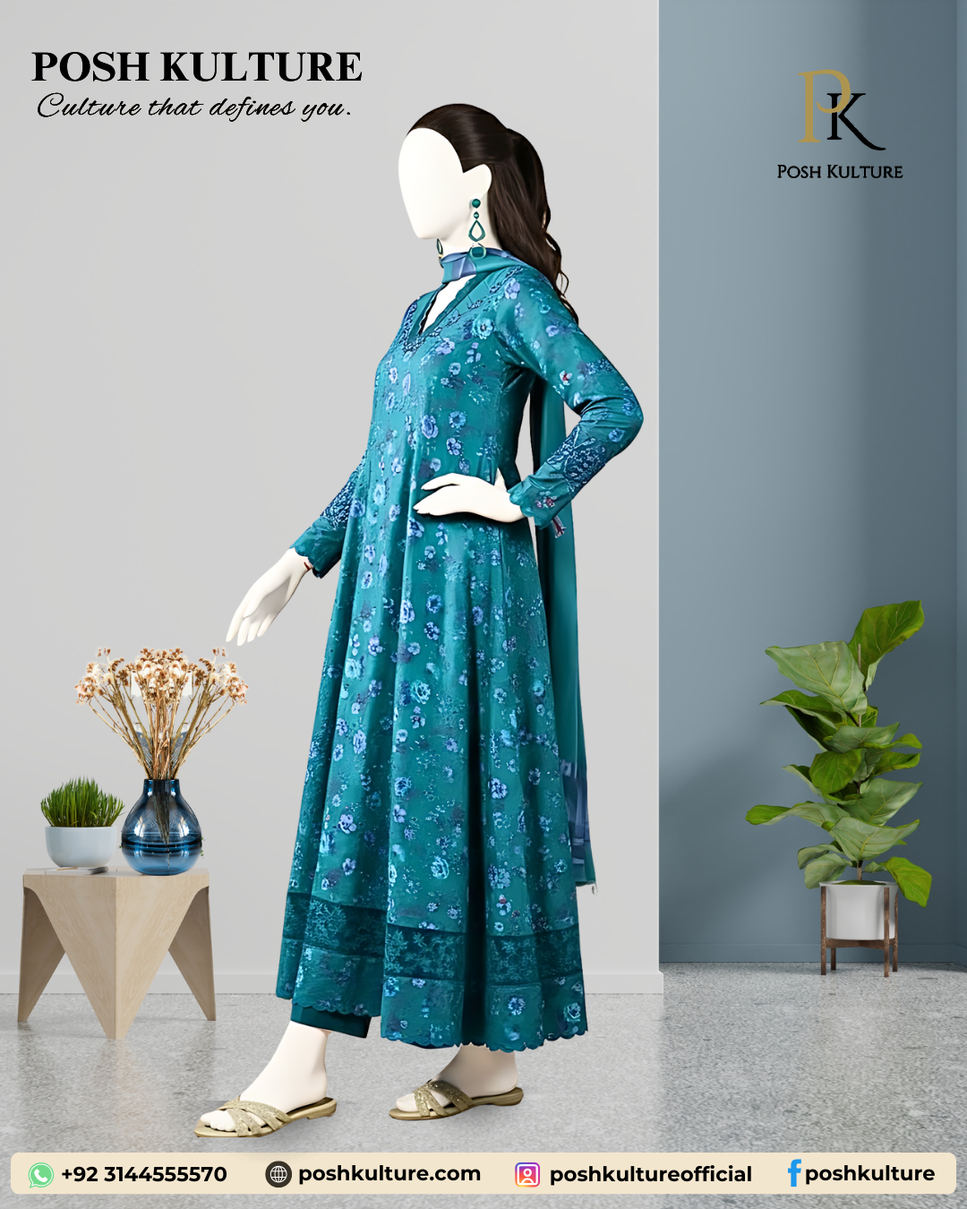 This Posh Kulture unstitched 3-piece dhanak suit features a striking teal/peacock blue color outfit perfect for winter. The main draw is the premium dhanak shirt showcasing luxury digital floral prints and a stylish, wide lace trim border. Complete with plain dyed trousers and a matching dhanak shawl, it’s an effortlessly elegant ensemble.