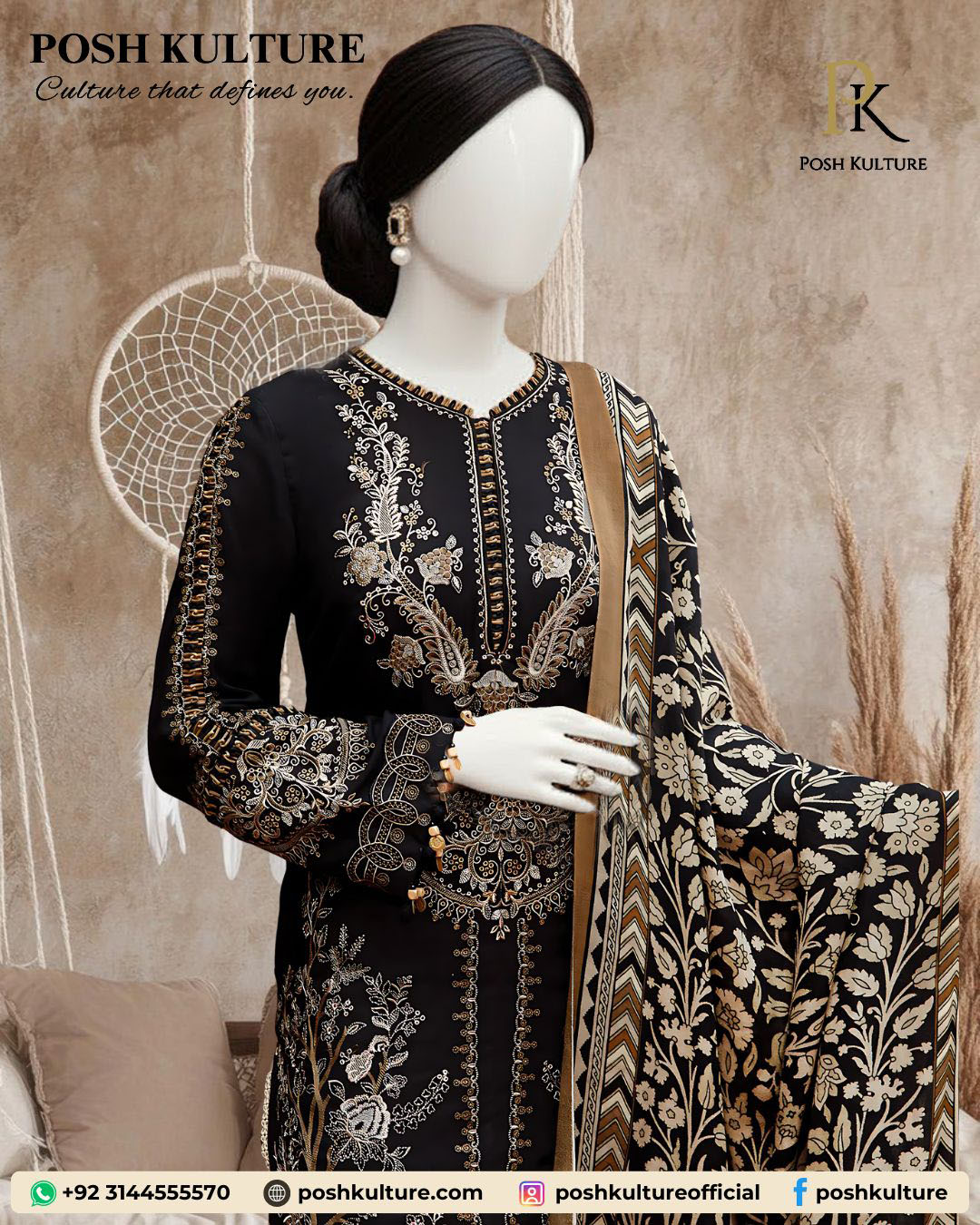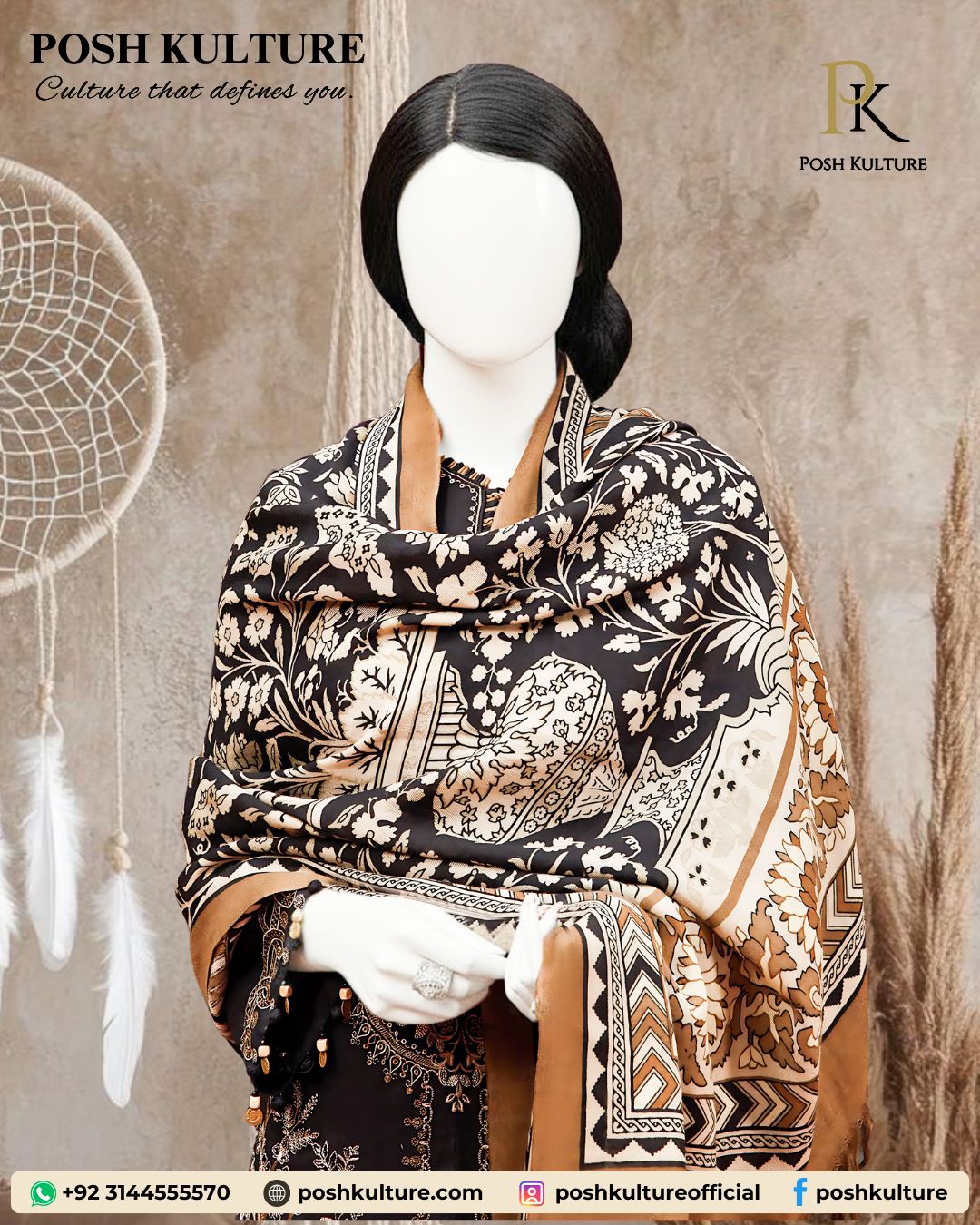 This elegant ensemble features a black dhanak suit showcasing rich gold and silver embroidery across the entire shirt front and sleeves. The trouser and back are kept plain for balance. It is perfectly complemented by a premium soft wool shawl, offering a sophisticated and stylish look