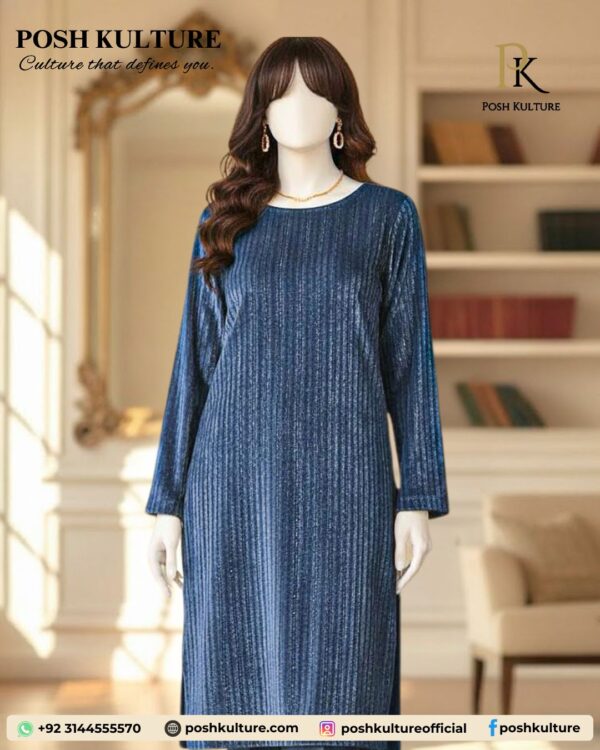 This trending 2PC suit features a sparkling blue chamki-lined velvet shirt (sleeves/back included) and plain trouser. Generous fabric cut: 3 Ghaz total (56-inch araz).