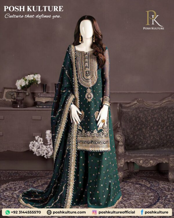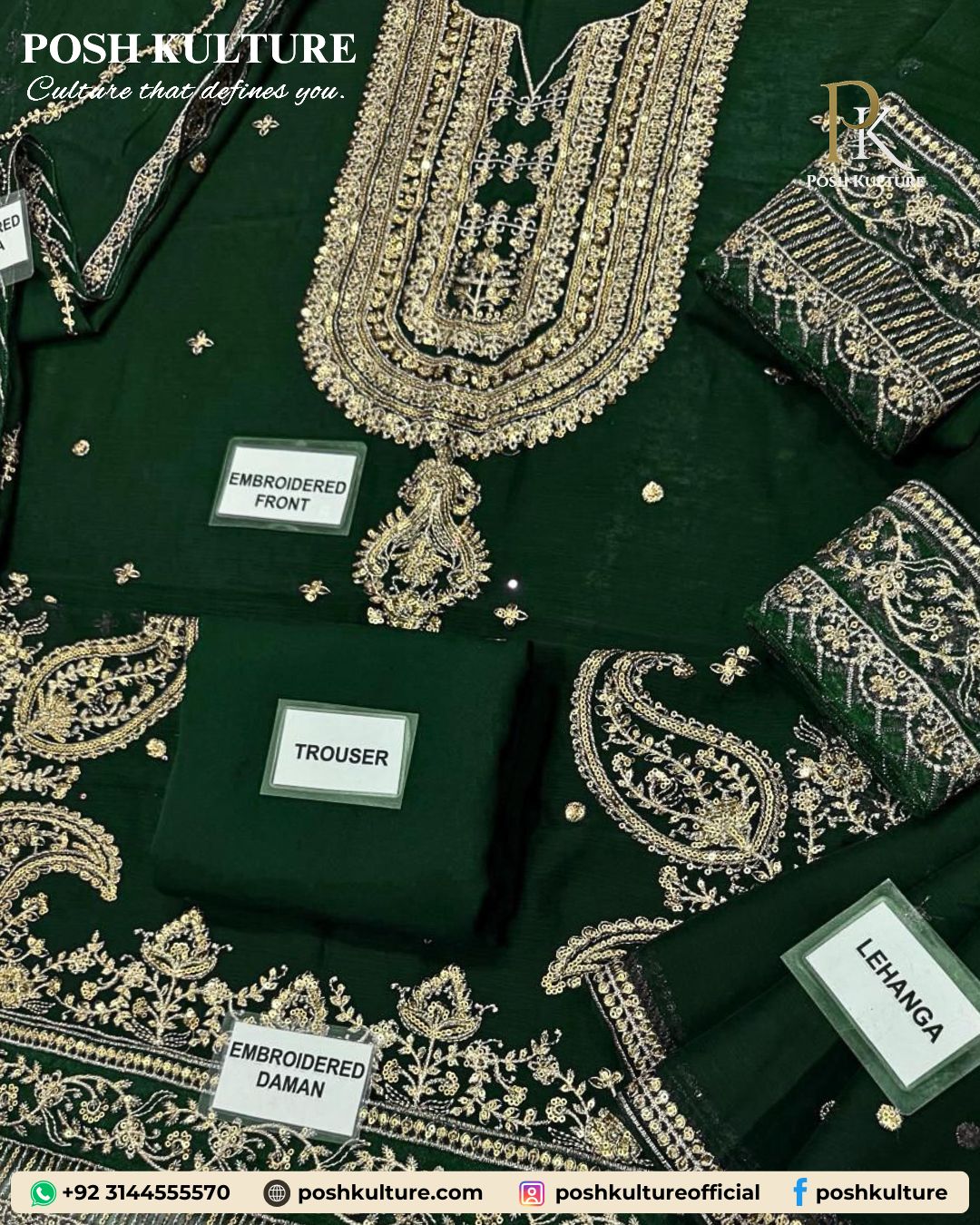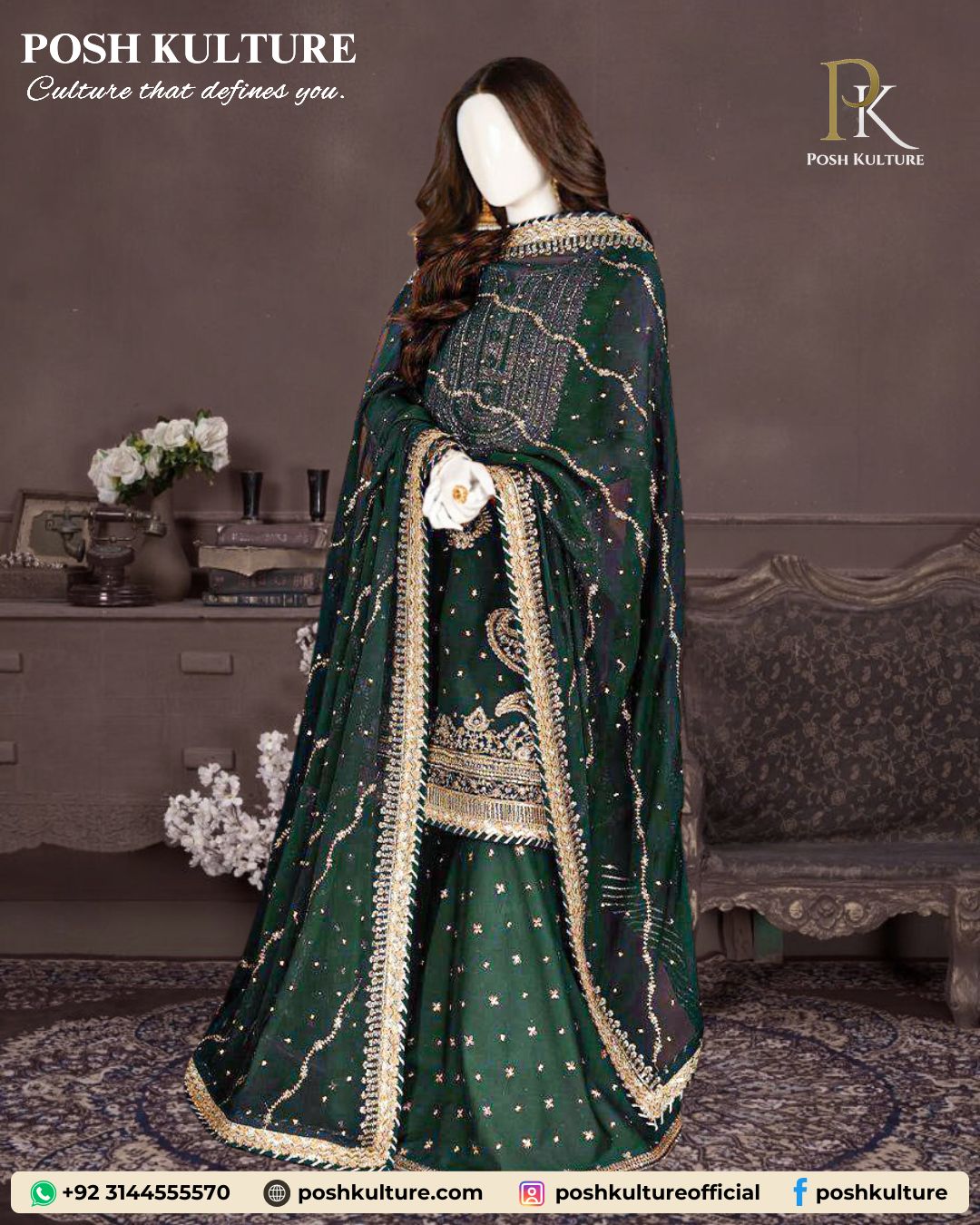 Tags: Emerald Gharara Lehnga, Heavy Embroidery Dress, Luxury Chiffon Suit