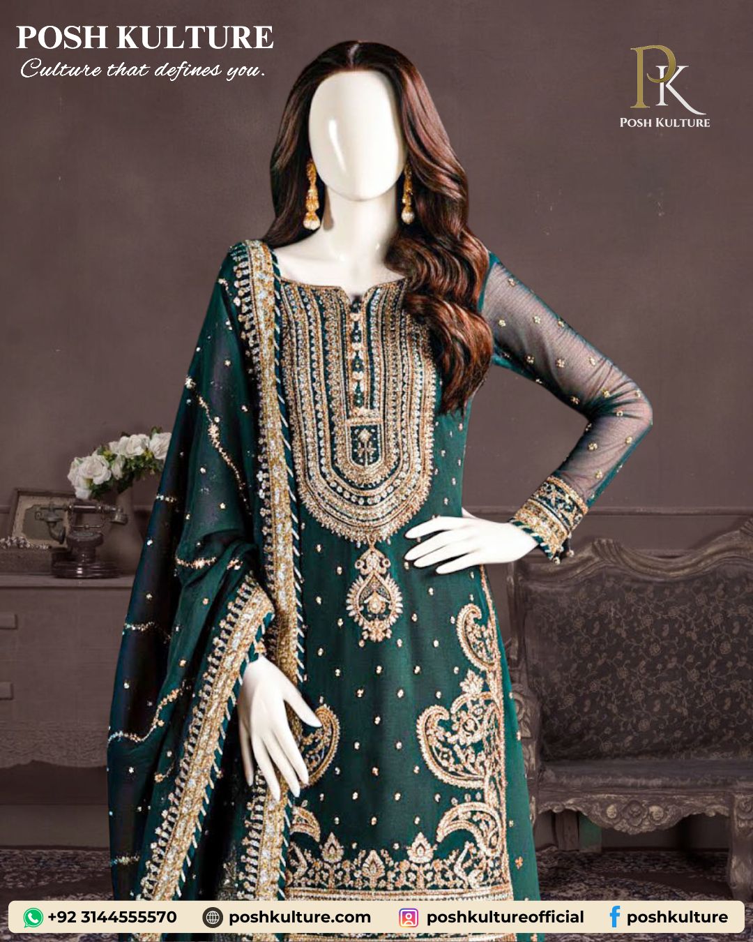 Wedding season ready! Shop this exquisite deep emerald chiffon suit featuring heavy embroidery, a detailed neck patch, and a stunning embroidered gharara/lehnga. Complete your look with the 4-sided lace dupatta. Luxury is calling—shop now! 💚✨