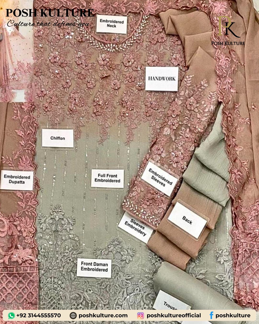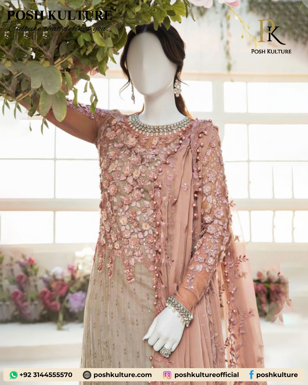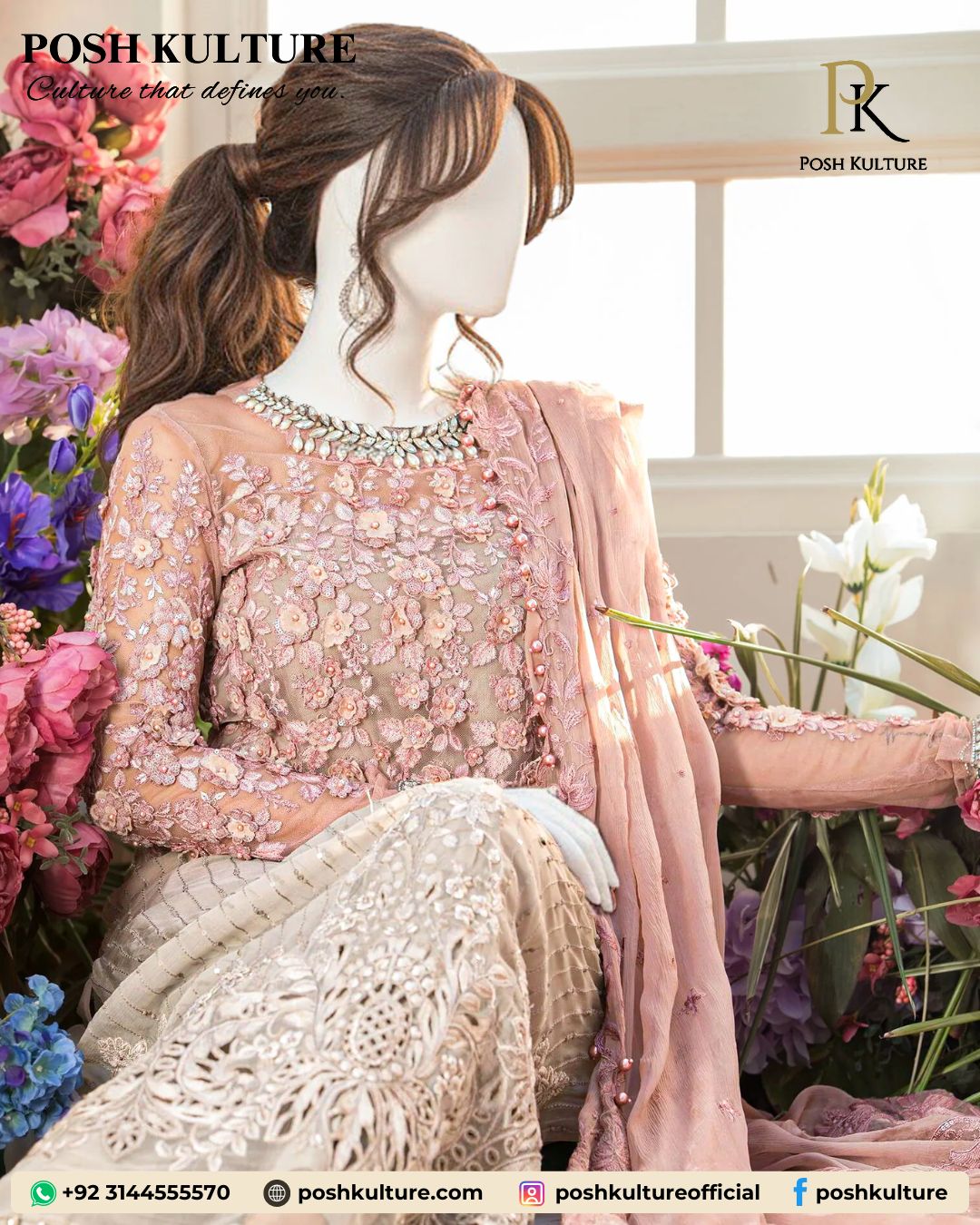 Bridal dream moment! Shop this exquisite tie & dye chiffon suit with 3D flower embellishments, intricate handwork, and a luxurious heavy dupatta. The soft beige and dusty rose tones are perfect for any wedding event. Claim your fairy-tale look—shop now! 🌸✨