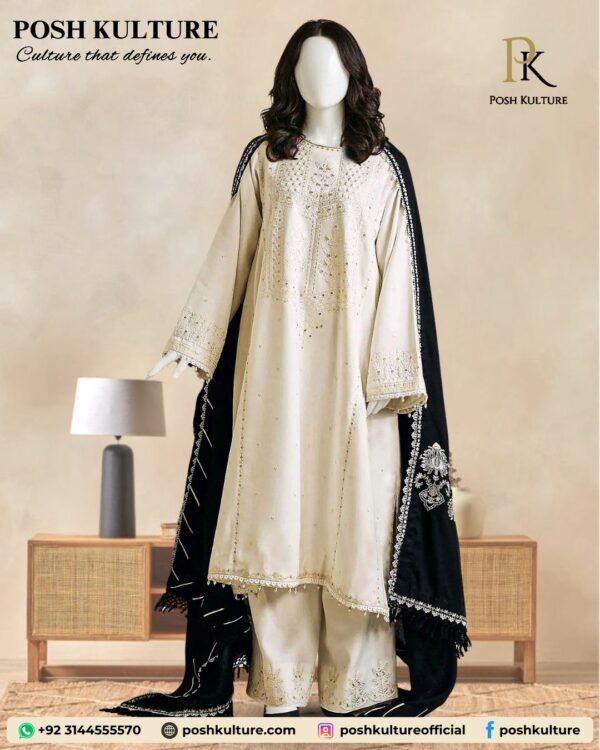 Indulge in the elegance of our white/off-white 3-piece Dhanak suit from the Winter Collection 2025. This unstitched ensemble is made from premium Dhanak fabric and features a heavy embroidered shirt front, luxurious heavy embroidered sleeves and daman, and is completed with a stunning, navy heavy embroidered wool Dhanak shawl.