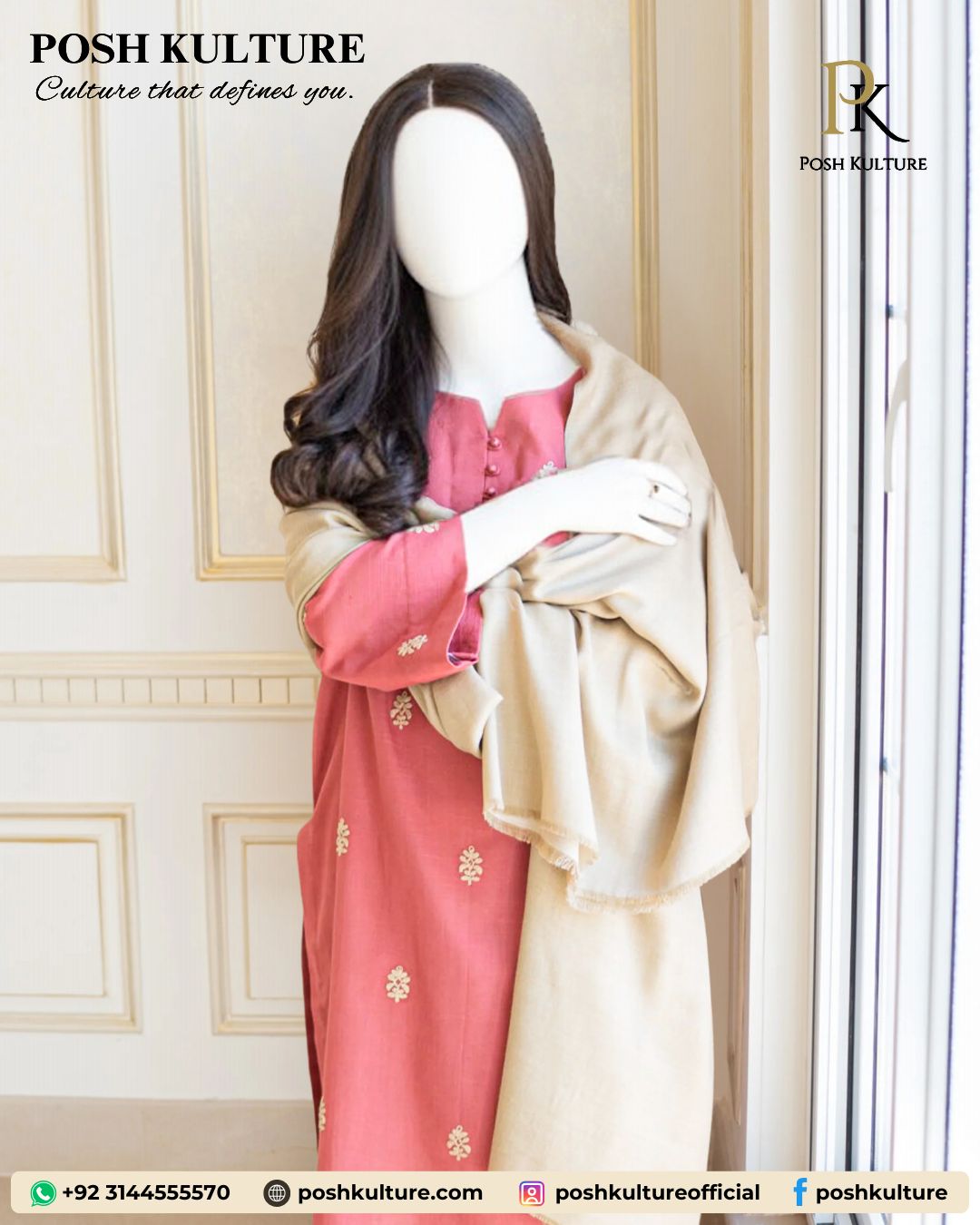 Luxury Coral Pink Embroidered Dhanak Suit with Tan Wool Shawl | Winter 2025
