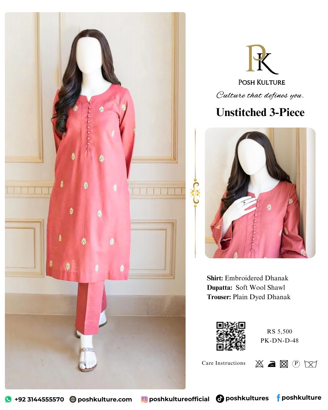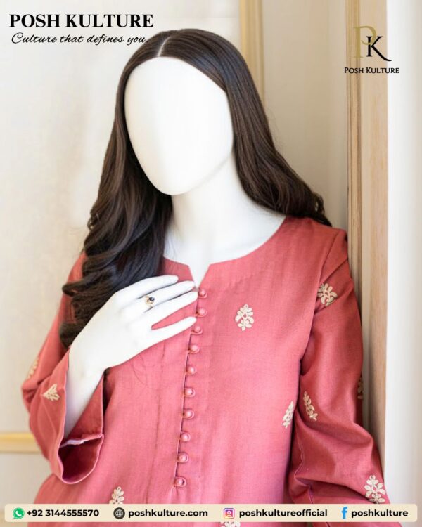 Style the new season with defining elegance! Presenting a luxury embroidered dhanak suit in a beautiful coral/pink shade from the winter 2025 collection. This exquisite 3-piece ensemble features an embroidered shirt front and embroidered sleeves for a truly opulent feel. It’s perfectly completed with a magnificent luxury premium soft dhanak embroidered wool shawl in a complementary tan/beige color. Don’t miss out on this stunning, high-quality article—shop the winter collection today!