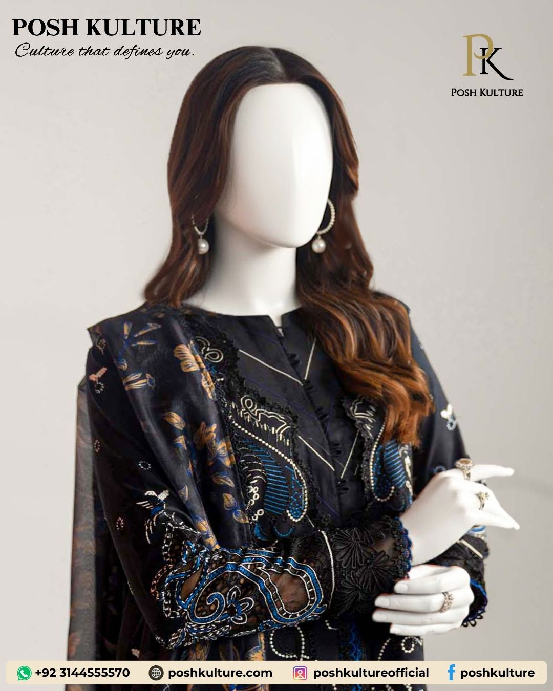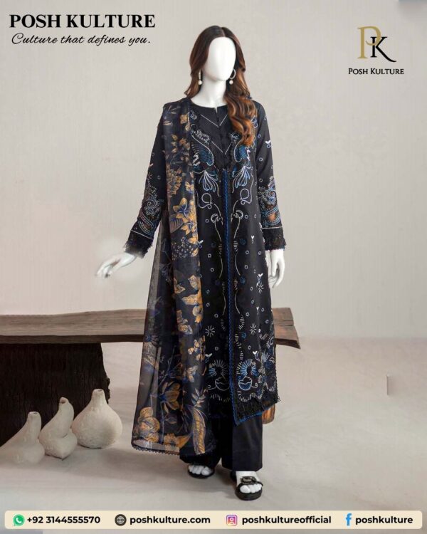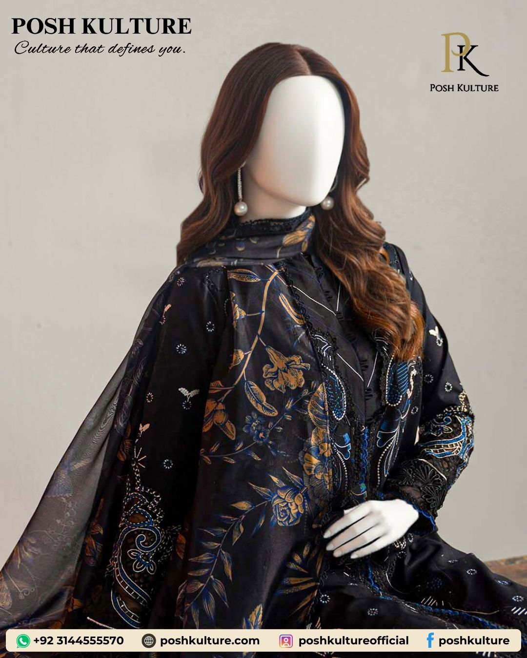 Own the season in the luxury embroidered Dhanak article. This premium 3-piece black Dhanak suit boasts a full heavy embroidered shirt and sleeves, brilliantly highlighted by gold/mustard, crisp blue, and white floral embroidery. The set is exquisitely finished with a premium luxury printed wool shawl that ties the motif together flawlessly.