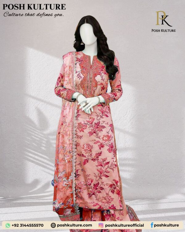 Introducing a beautiful new arrival for winter 2025. This soft pink Dhanak 3-piece suit features a stunning digital floral print with shades of fuchsia and maroon, highlighted by an intricately embroidered neckline and delicate lace detailing on the dupatta.