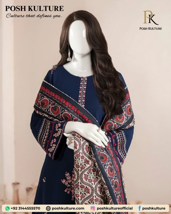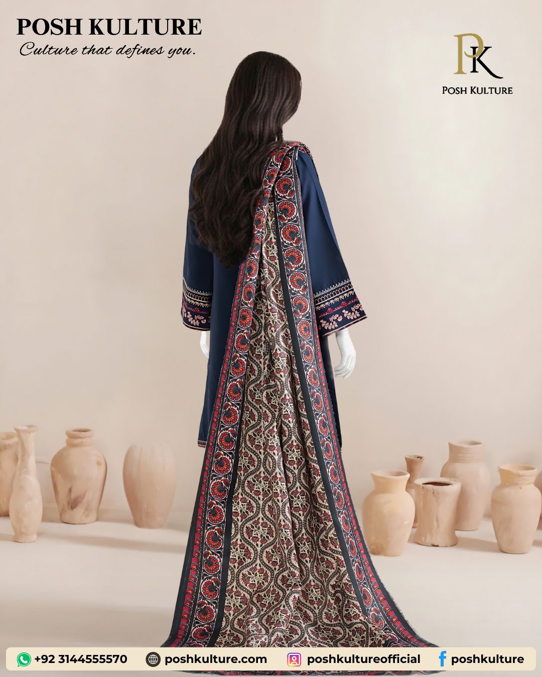 This elegant ensemble features a navy blue dhanak suit. The shirt front is fully adorned with embroidery, and the sleeves showcase heavy embroidered work. The outfit is completed with embroidered trouser. The suit is paired with a premium soft wool shawl that features a beautiful printed, multicolor design, prominently displaying black, red, and beige tones.