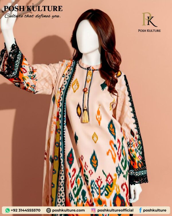 Introducing our Luxury Printed Karandi 3-Piece Suit from the Winter Collection 2025! This premium quality ensemble features a striking digital print in a beautiful blend of warm beige/peach tones accented with vibrant pops of orange, green, and multi-color traditional patterns. The set includes a Digital Karandi Printed Shirt, Trouser, and Dupatta, all with impeccable quality and finishing. Upgrade your style this winter—shop this exclusive print today!