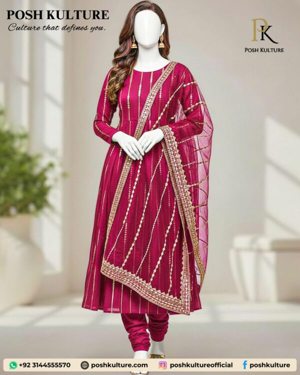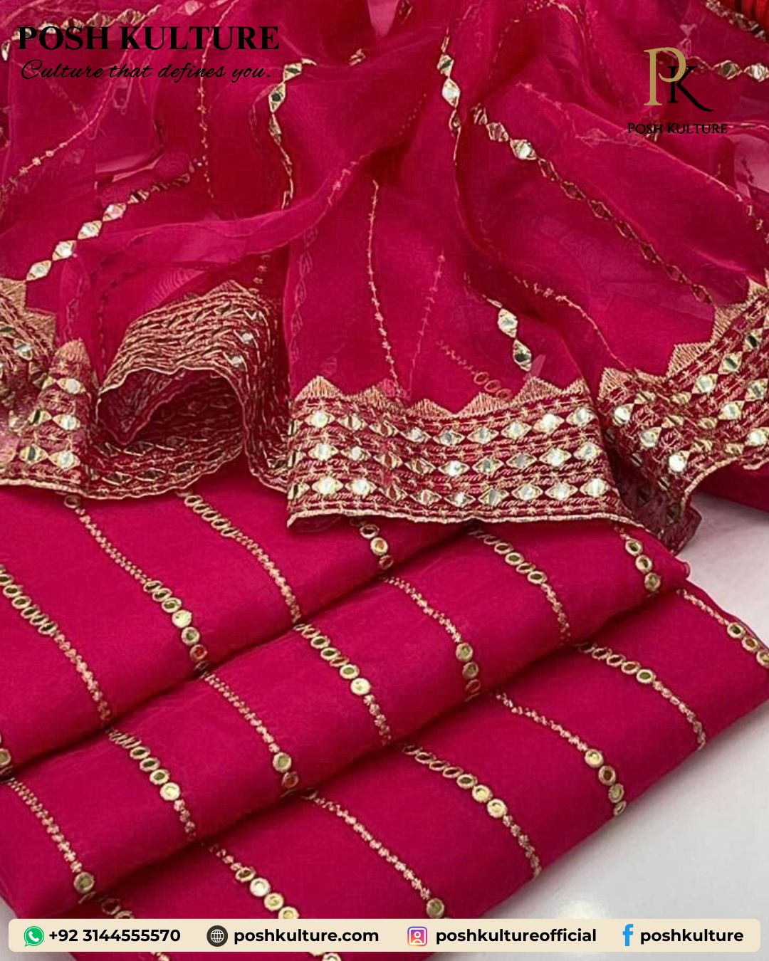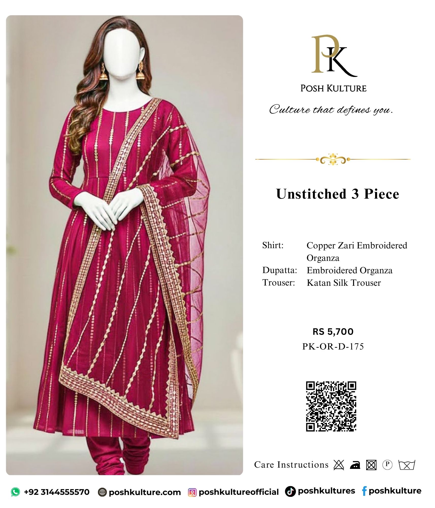 Adorn yourself in this gorgeous Arshi Pink Unstitched 3-piece ensemble! It features elegant golden Zari threadwork detailing on the shirt fabric and is paired with a ready-to-wear net dupatta with a detailed border. Complete the look with the Katan silk trouser fabric included. Elevate your festive wardrobe and shop this vibrant color today!