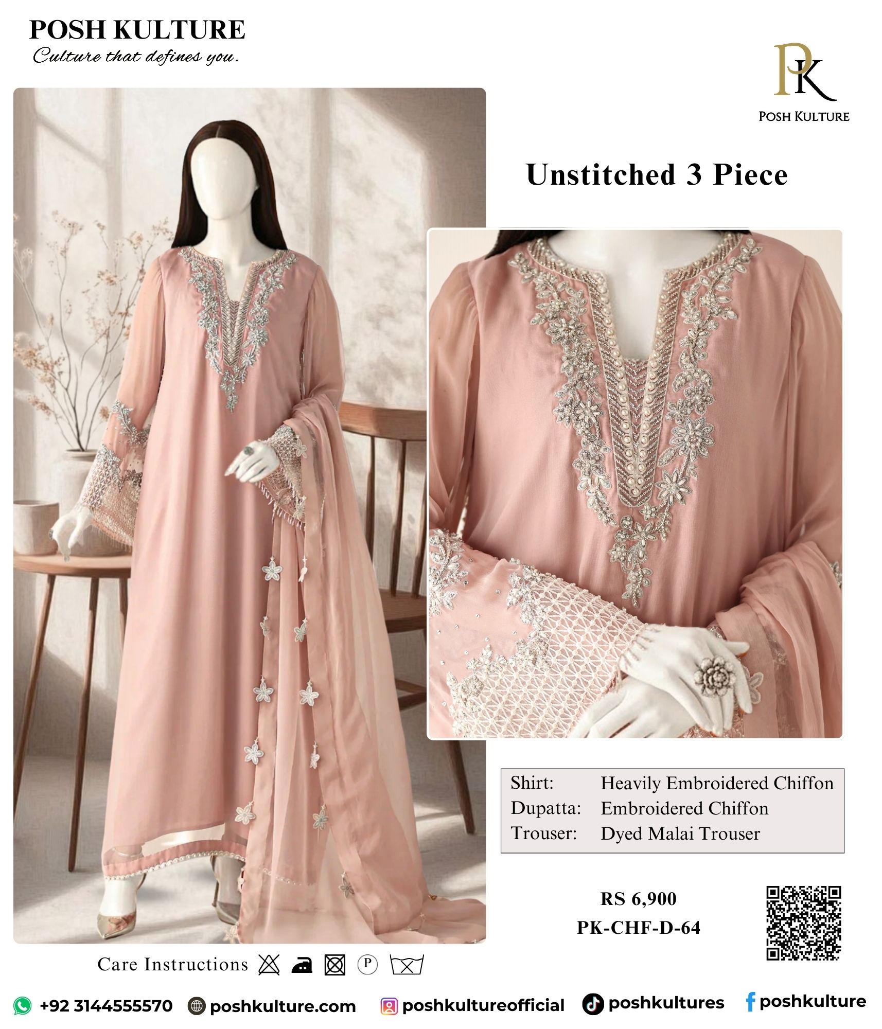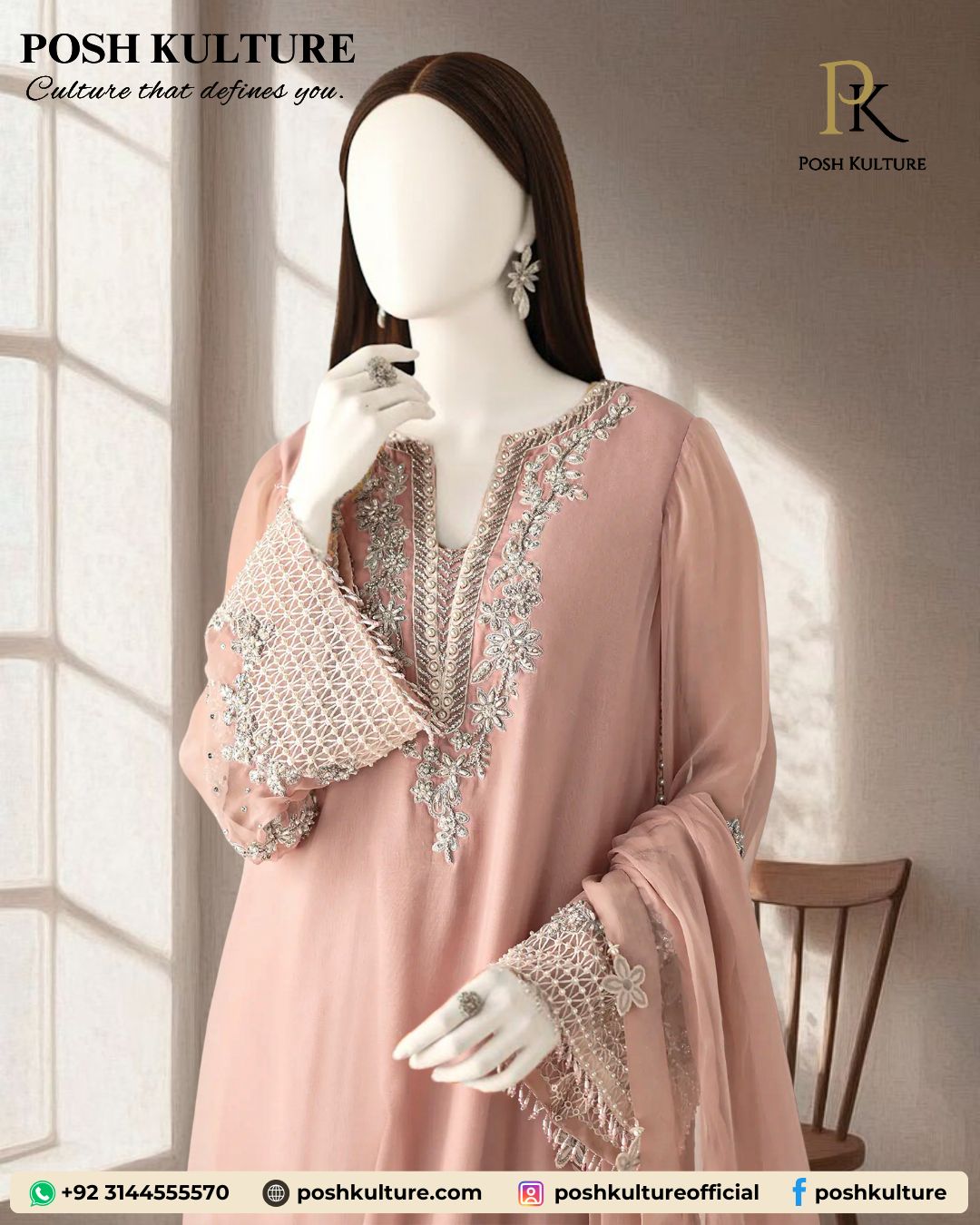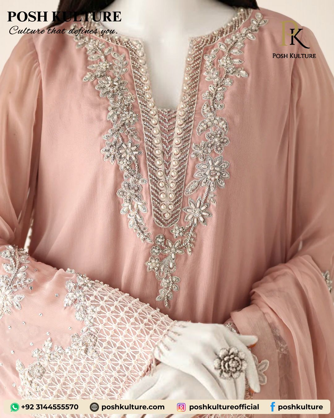 Presenting our luxury hand-embellished chiffon festive suit in soft pink (Collection 2025). The chiffon shirt features elegant heavy adda work at the neckline and sleeves, complemented by dyed malai trouser. The ready-to-wear chiffon dupatta is a highlight, finished with heavy embroidery and 3D tassels on all sides. Secure this exquisite, premium piece for your festive wardrobe today!