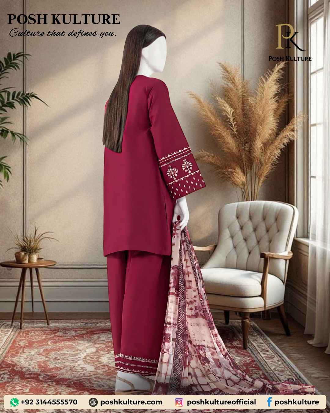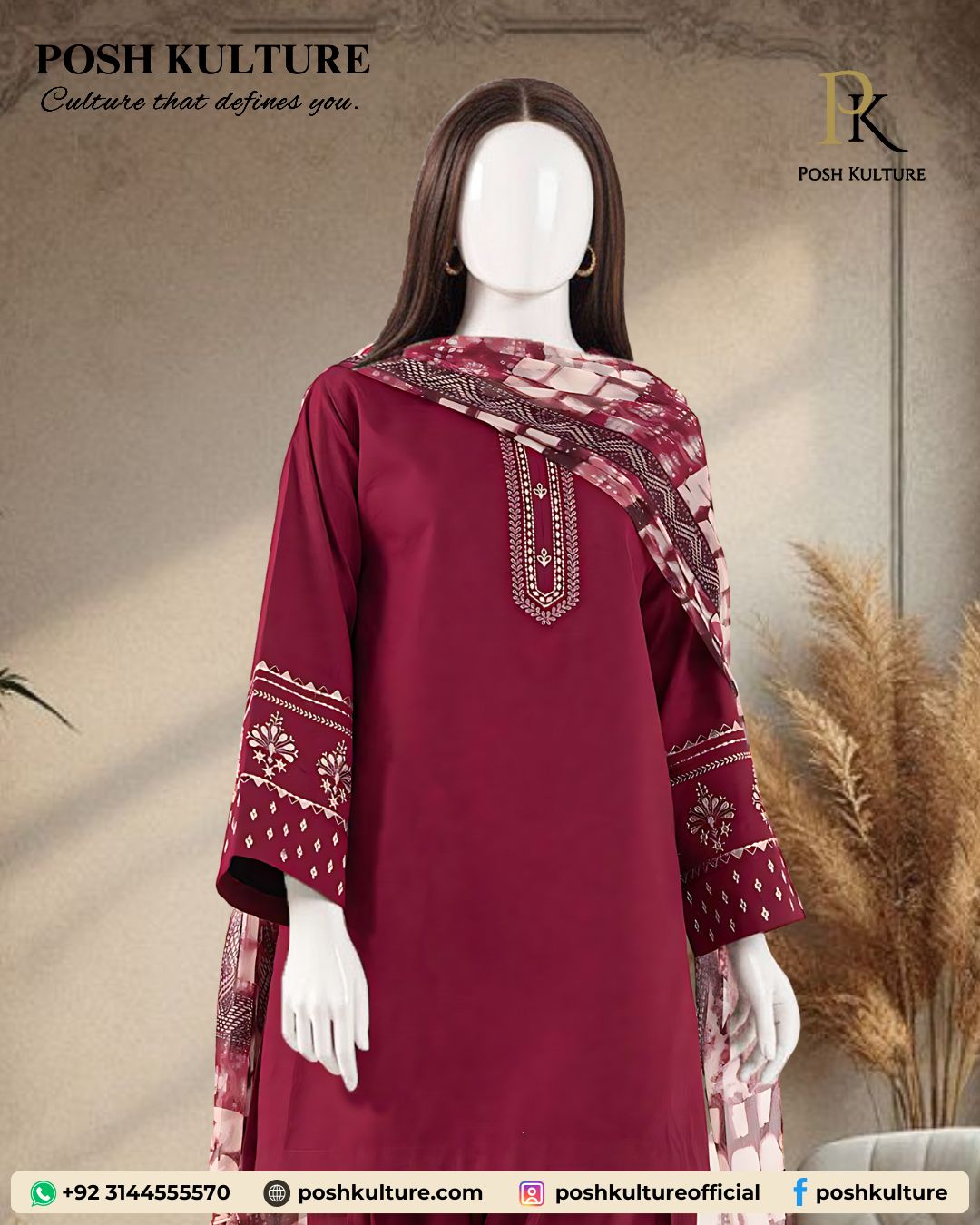 Deep maroon dhanak fabric, this luxury unstitched 3-piece suit is the must-have hit code of the Posh Kulture winter 2025 collection. The set features a plain dyed shirt with an elegant embroidered neck patch and heavily embroidered sleeves, plus a plain trouser with an embroidered patch. It’s perfectly completed by a premium soft wool printed shawl. Shop this elegant winter ensemble today and define your style