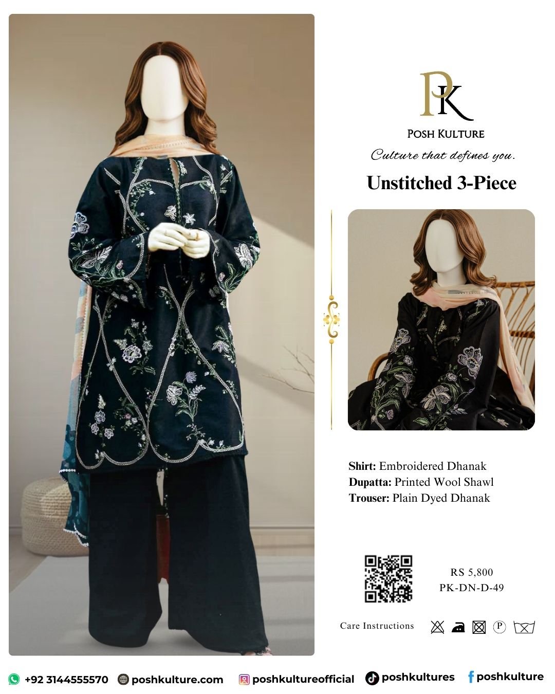 Presenting a premium luxury embroidered dhanak suit in black. This 3-piece masterpiece features a fully heavy embroidered shirt front and sleeves. It’s perfectly paired with a premium luxury soft wool shawl showcasing subtle printed detail. Don’t miss this stunning article—shop the winter collection today!