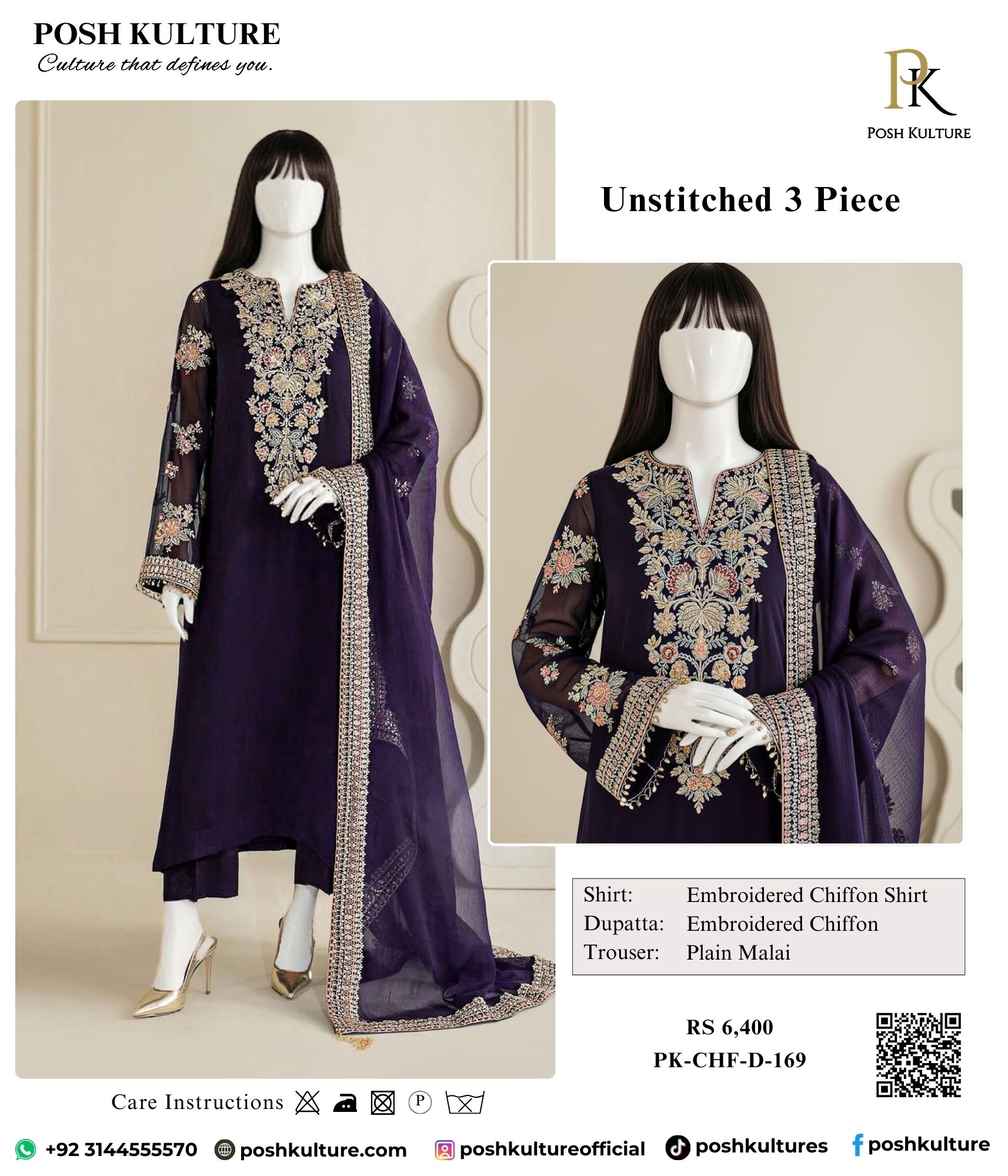 Command attention this season in regal Deep Purple! This luxurious unstitched 3-piece ensemble in a rich Deep Purple features a chiffon shirt with elegant, heavy V-neck embroidery and delicate floral embroidered sequence work on the sheer chiffon sleeves. The set is completed with a ready-to-wear chiffon dupatta featuring a broad, ornamental embroidered border and a plain Malai trouser. This is the perfect formal attire for any special occasion or wedding event.
