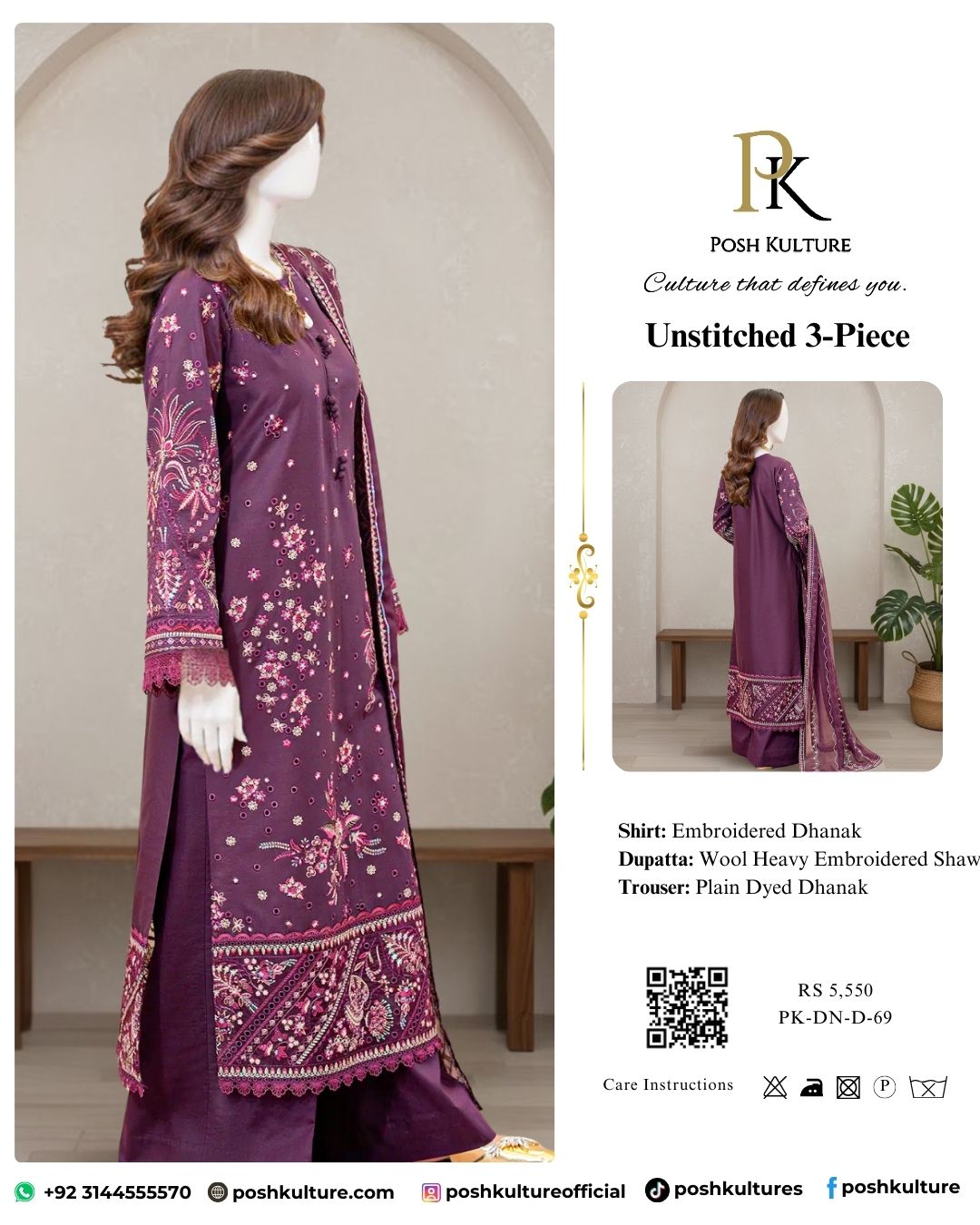 Elevate your style with the premium heavy embroidered Dhanak article. This exquisite 3-piece deep plum suit features a richly embroidered Dhanak shirt, adorned with detailed floral work in pink, white, and teal, and is complemented by a magnificent Luxury Wool Heavy Embroidered Shawl. Secure this must-have, heavily embellished outfit for sophisticated seasonal wear today.
