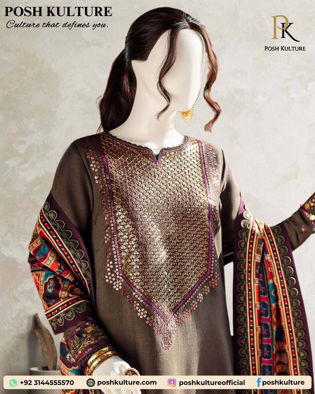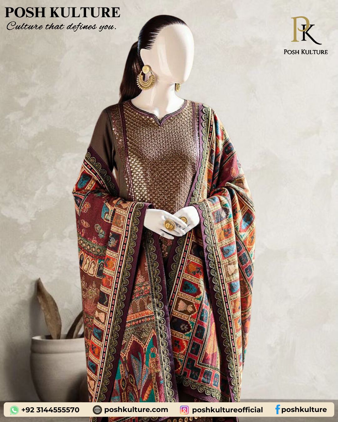 Introducing the Luxury Embroidered Hit Code Article. This stunning suit in a rich dark cocoa/taupe hue features a Dhanak fabric shirt with full heavy metallic embroidery and sequin work on the front, complemented by heavy embroidered sleeves and a decorated daman patch. The solid trouser and back balance the look, which is crowned by a breathtaking Premium Soft Wool Printed Shawl in vibrant jewel tones (red, orange, teal, and gold). A must-have for winter elegance.