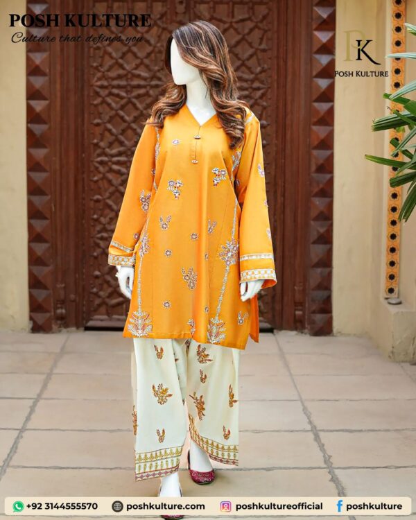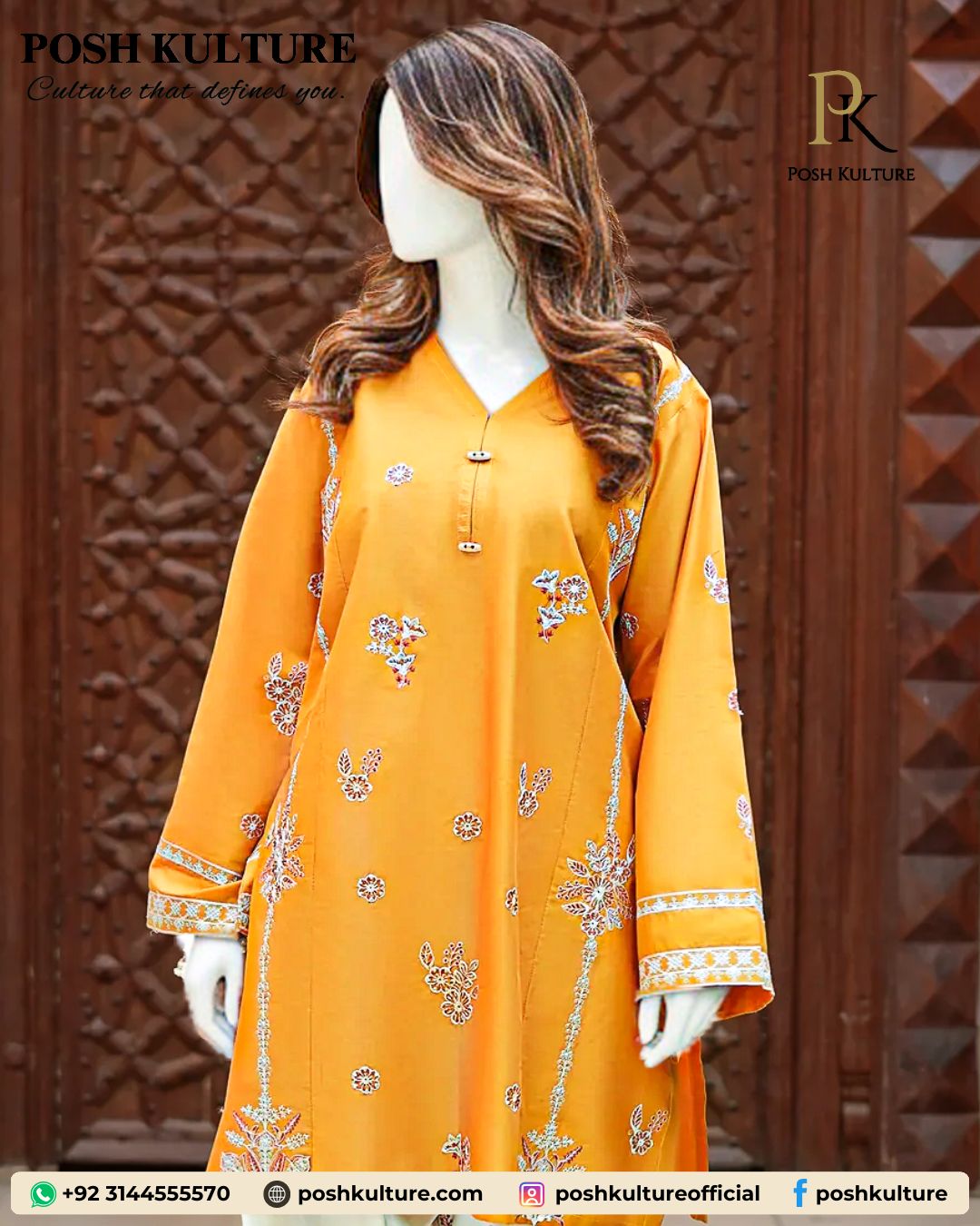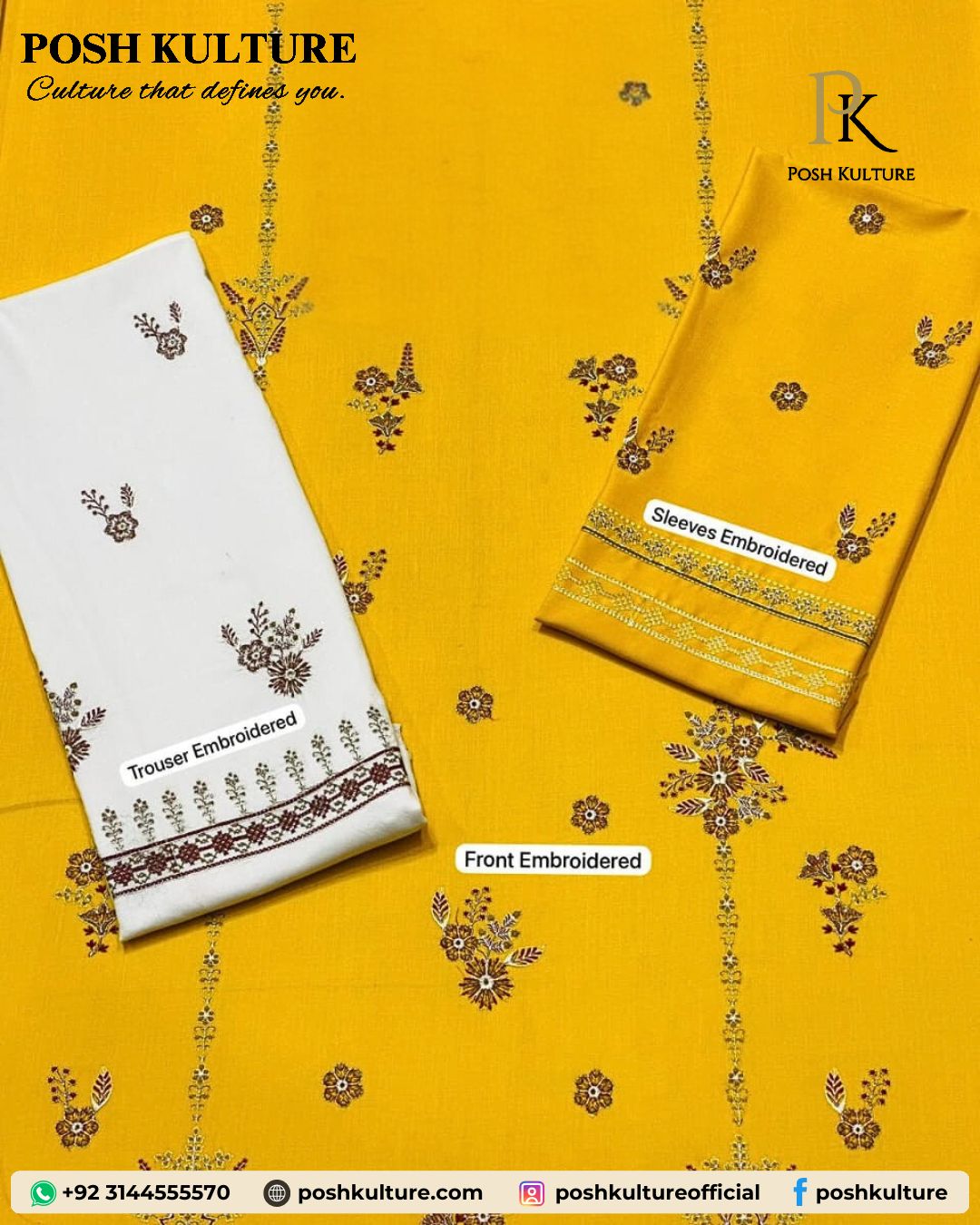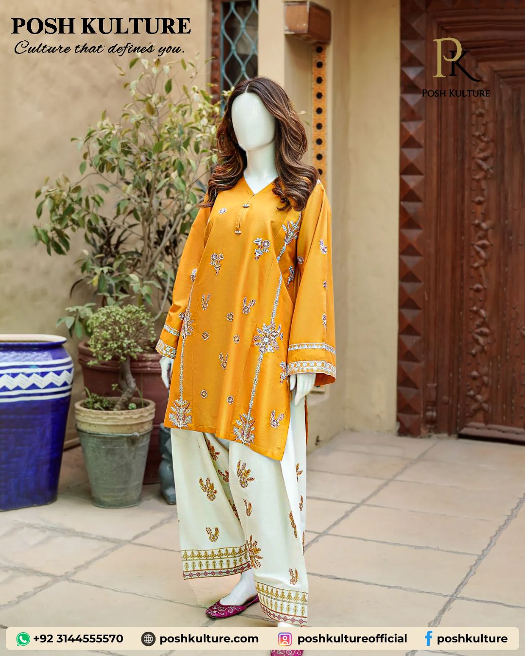 Step out in luxury with this stunning 2-piece embroidered Dhanak suit from Posh Kulture’s Winter 2025 Collection. The premium mustard shirt features intricate heavy embroidery on the front and sleeves, perfectly paired with coordinating heavy embroidered trousers. Experience guaranteed superb color and high-quality fabric in this complete, elegant ensemble.