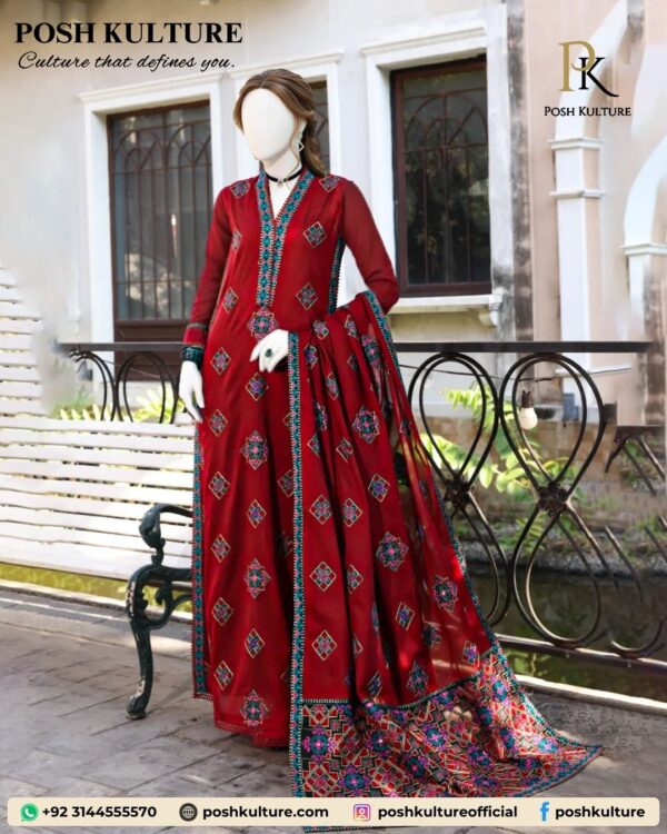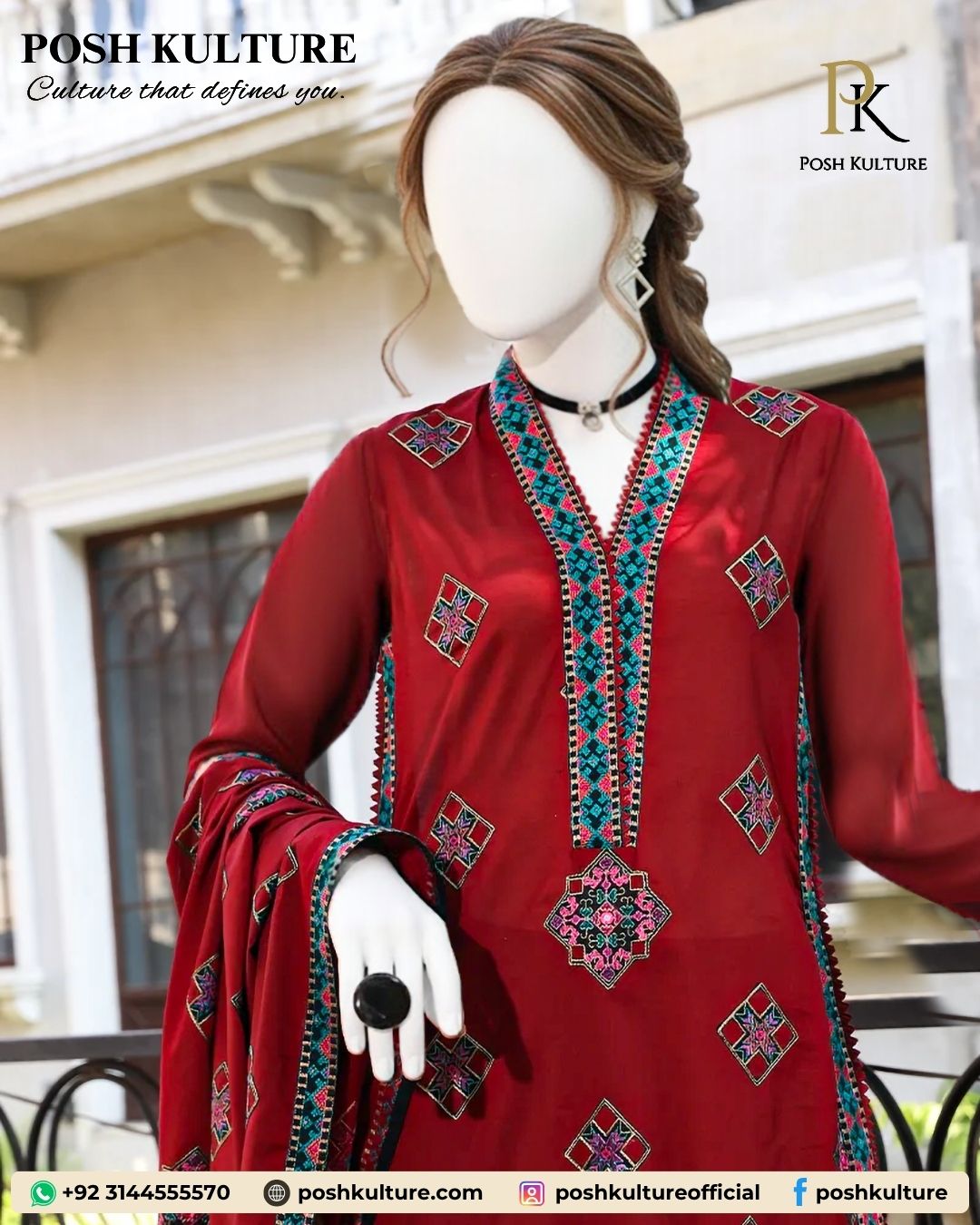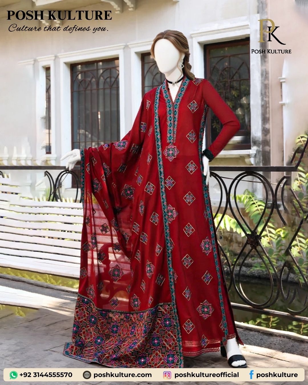 Tags: 3-piece Dhanak Suit, deep red, Heavy Embroidered Shawl