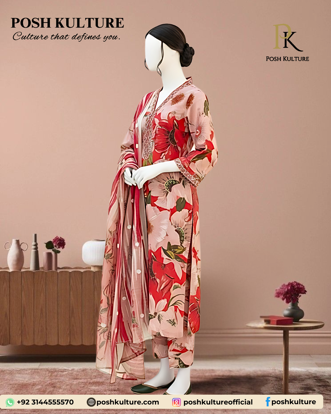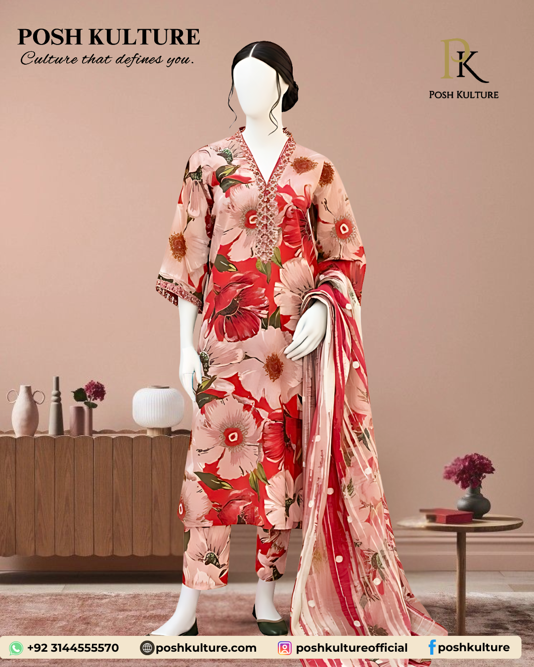 Turn heads in this vibrant Posh Kulture 3-piece unstitched suit! Made from premium dhanak fabric (khaddar-like). The centerpiece is the luxury digital-printed dhanak shirt, saturated with bold red and pink floral prints. It comes perfectly paired with plain dyed trousers and an equally stunning luxury digital dhanak printed shawl. Your new statement piece awaits! Change the first line, or replace it.