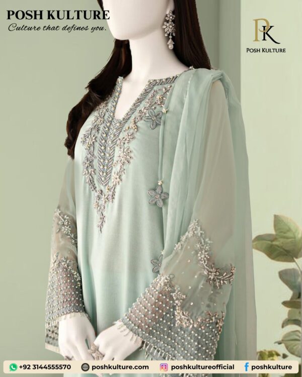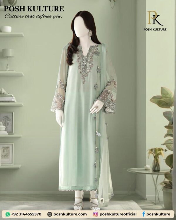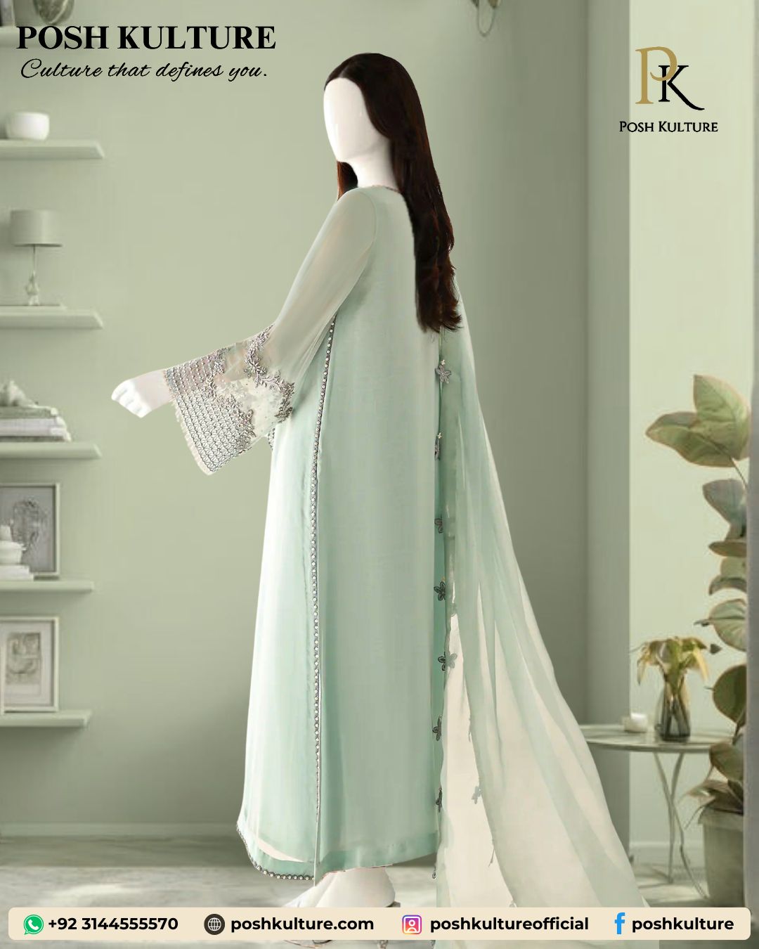 Introducing our luxury chiffon hand-embellished festive suit in serene seafoam green. The chiffon shirt features elegant heavy adda work at the neckline and sleeves, complemented by soft dyed malai trouser. The ready-to-wear chiffon dupatta is a highlight, finished with heavy embroidery and 3D tassels on all sides. Unleash your most confident look—secure this exclusive piece for your wardrobe today!