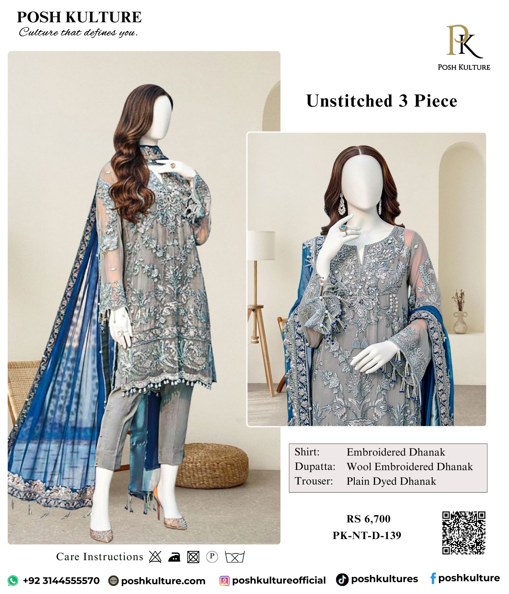Experience luxury in this heavily embroidered net suit in a sophisticated subtle grey tone, featuring intricate handwork and sequins. The ensemble is dramatically contrasted by a magnificent royal blue net dupatta and soft malai trousers.