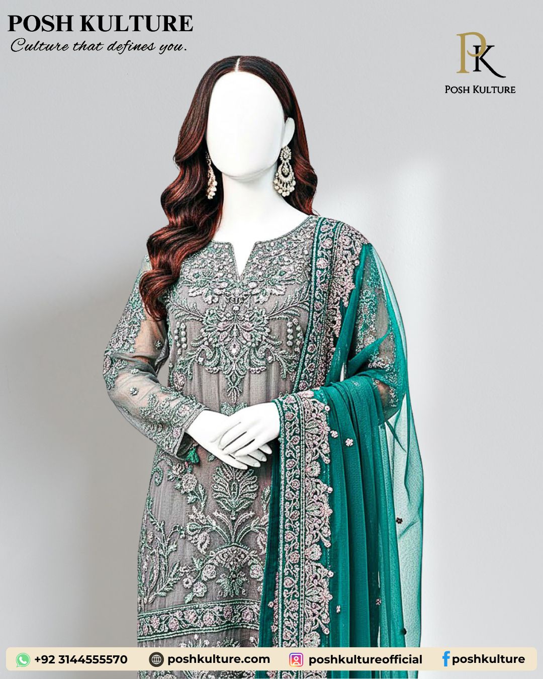 Captivate in this heavily embroidered net suit in a classic slate grey, enhanced by intricate handwork and sequins. It is gorgeously accented by a vibrant teal net dupatta and premium malai trousers.