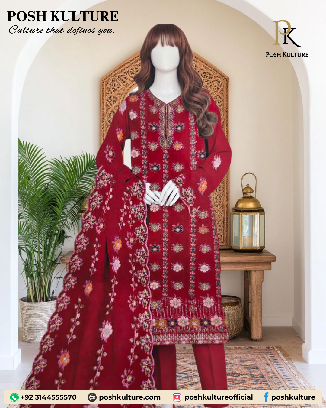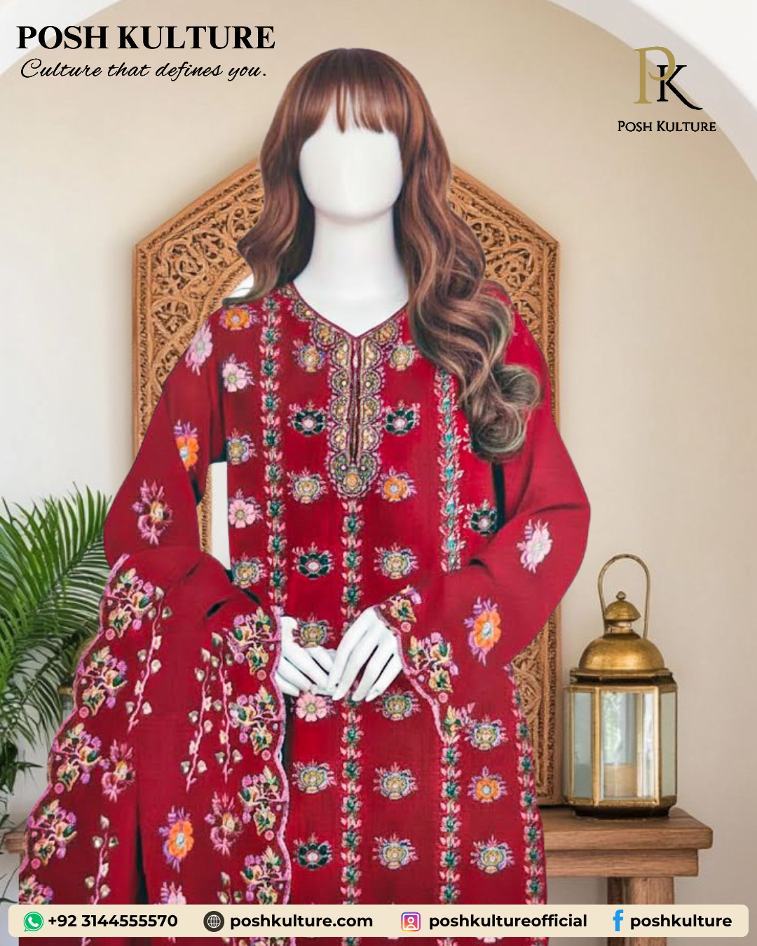 Turn heads with this luxurious 3-piece chiffon masterpiece in a regal deep red. Adorned with intricate floral embroidery in delicate pinks, whites, and oranges, this ensemble exudes elegance. The richly embroidered neckline, detailed shirt, and stunningly crafted dupatta make it a timeless choice for any festive or formal occasion.