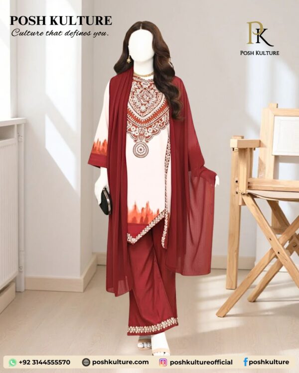 This exquisite 3-piece suit from Posh Kulture is designed for sophisticated style and crafted from high-quality shamooz silk. The entire ensemble showcases a rich maroon tone through intricate digital printing on the shirt and trousers, perfectly harmonizing with the coordinating silk dupatta. Experience the luxury and superior finish of this stunning outfit.