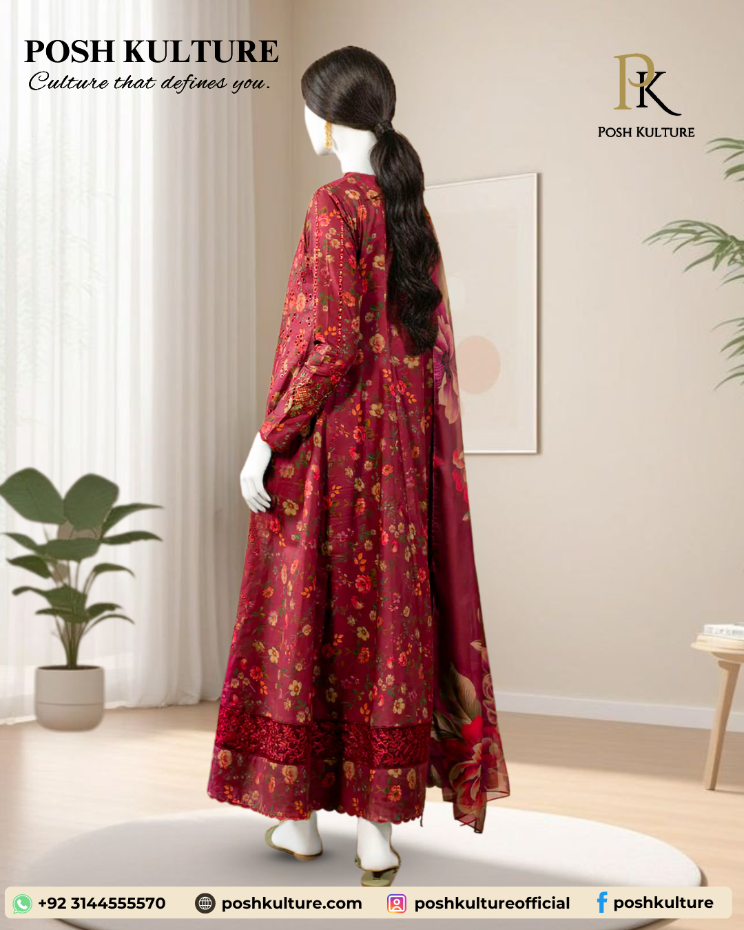 Discover timeless elegance with this Posh Kulture 3-Piece Unstitched Dhanak Suit. This outfit’s main highlight is the luxurious Dhanak shirt, deeply colored in maroon and adorned with intricate embroidered floral patterns and a detailed lace border. Paired with plain dyed trousers and a coordinating Dhanak shawl, this is a complete, sophisticated look. Upgrade your festive collection—order this exquisite Dhanak suit today!