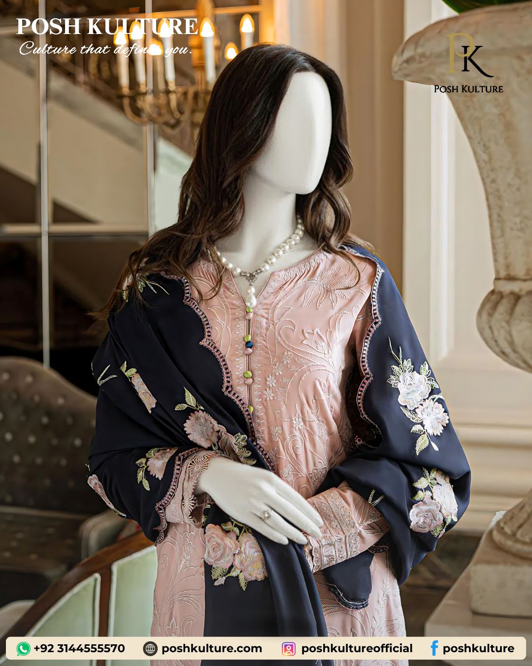 This elegant 3-piece dhanak suit features a light pink shirt with extensive embroidery covering the front, sleeves, and daman patch. The back and trousers are plain. The ensemble is finished with a premium dhanak shawl, which boasts its own heavy embroidery, creating a refined and detailed look.
