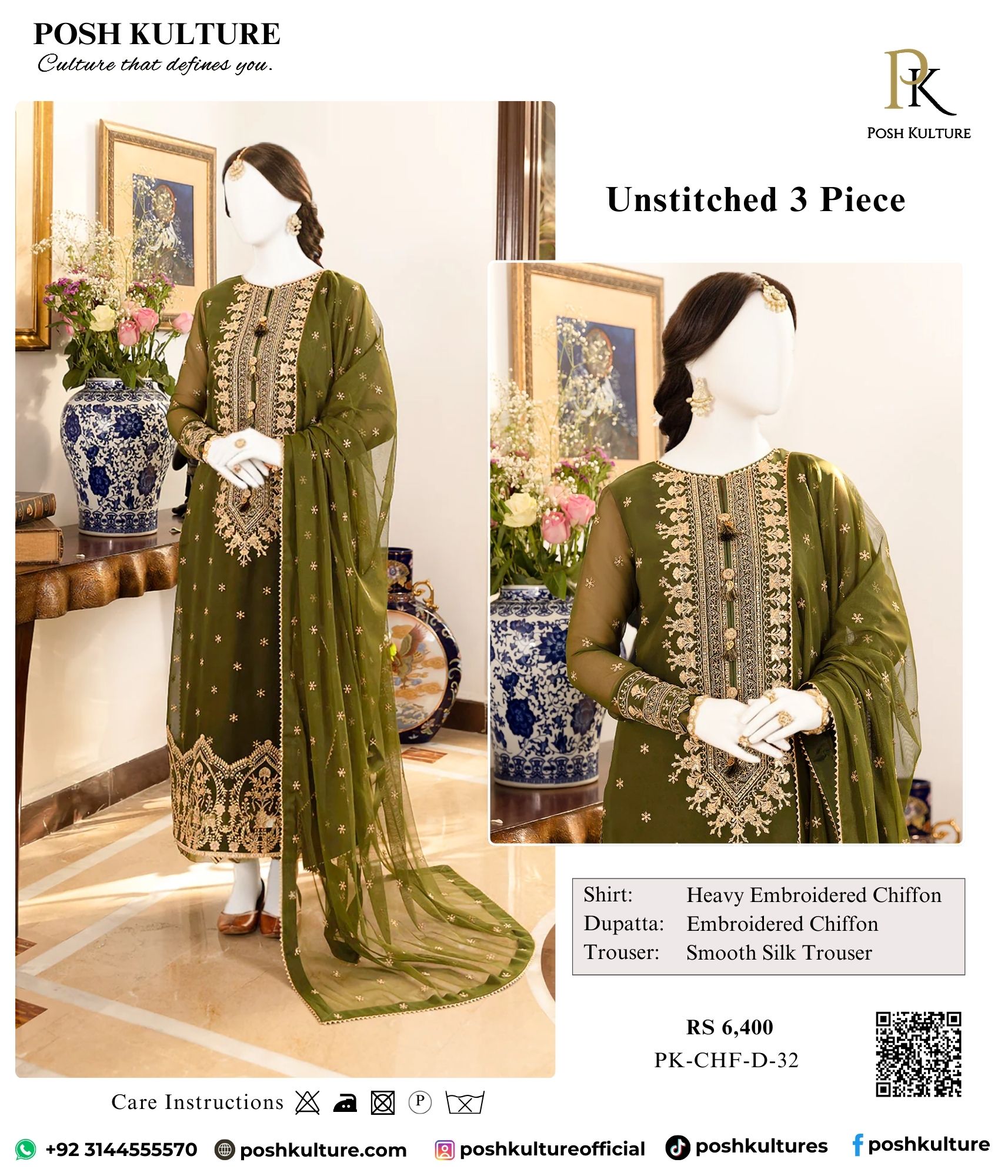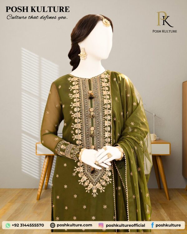 Luxury embroidered olive green chiffon ensemble. This stunning 3-piece features a heavy embroidered chiffon front with elegant detailing and an embroidered daman border. The set includes fully embroidered chiffon sleeves, an intricately designed heavy embroidered chiffon dupatta with 4-sided lace, and smooth silk trouser for luxurious comfort.