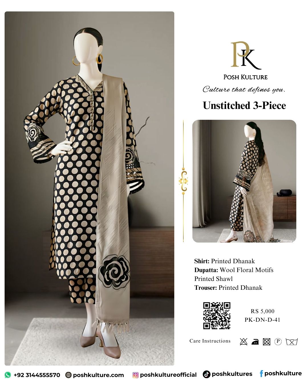 Winter Collection 2025: A luxurious dhanak 3-piece suit in a classic black/beige color palette. This design pairs a luxury digital-printed shirt with matching trousers and a coordinating printed khaddar shawl that features prominent floral motifs. Perfect for sophisticated winter wear.