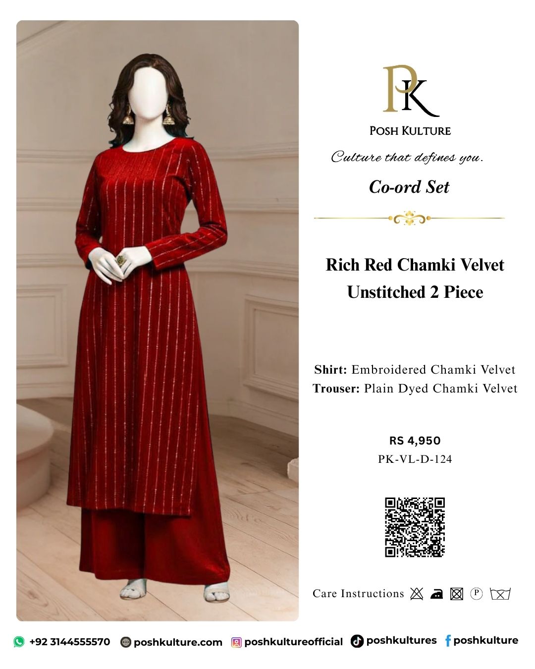This trending 2PC suit features a luxurious red chamki-lined velvet shirt (sleeves/back included) and plain trouser. Generous fabric cut: 3 Ghaz total (56-inch araz).