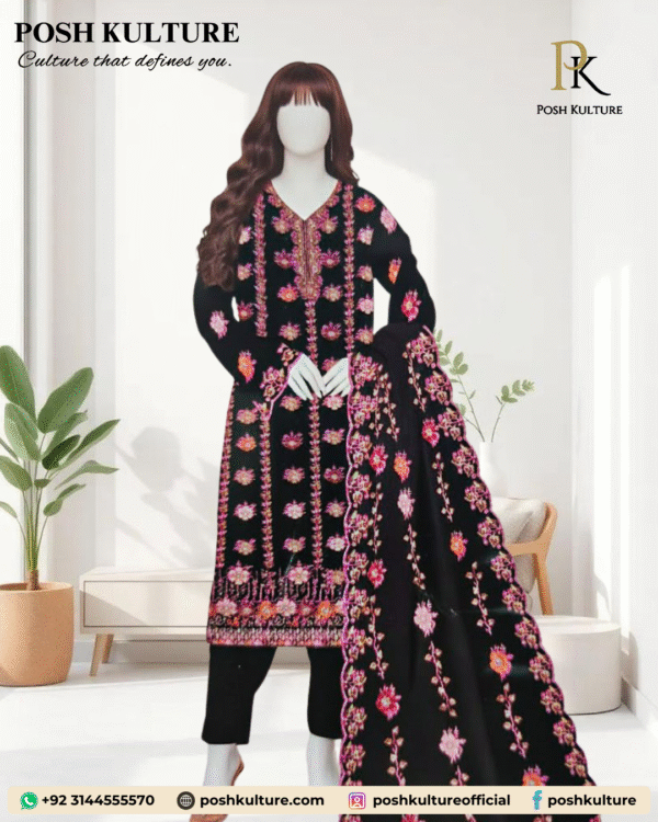 Elevate your style with this stunning 3-piece chiffon ensemble in a timeless black base adorned with intricate floral embroidery in vibrant pinks and oranges. The delicate craftsmanship on the neckline and sleeves, paired with a beautifully embroidered dupatta, makes this outfit a perfect choice for any festive occasion.