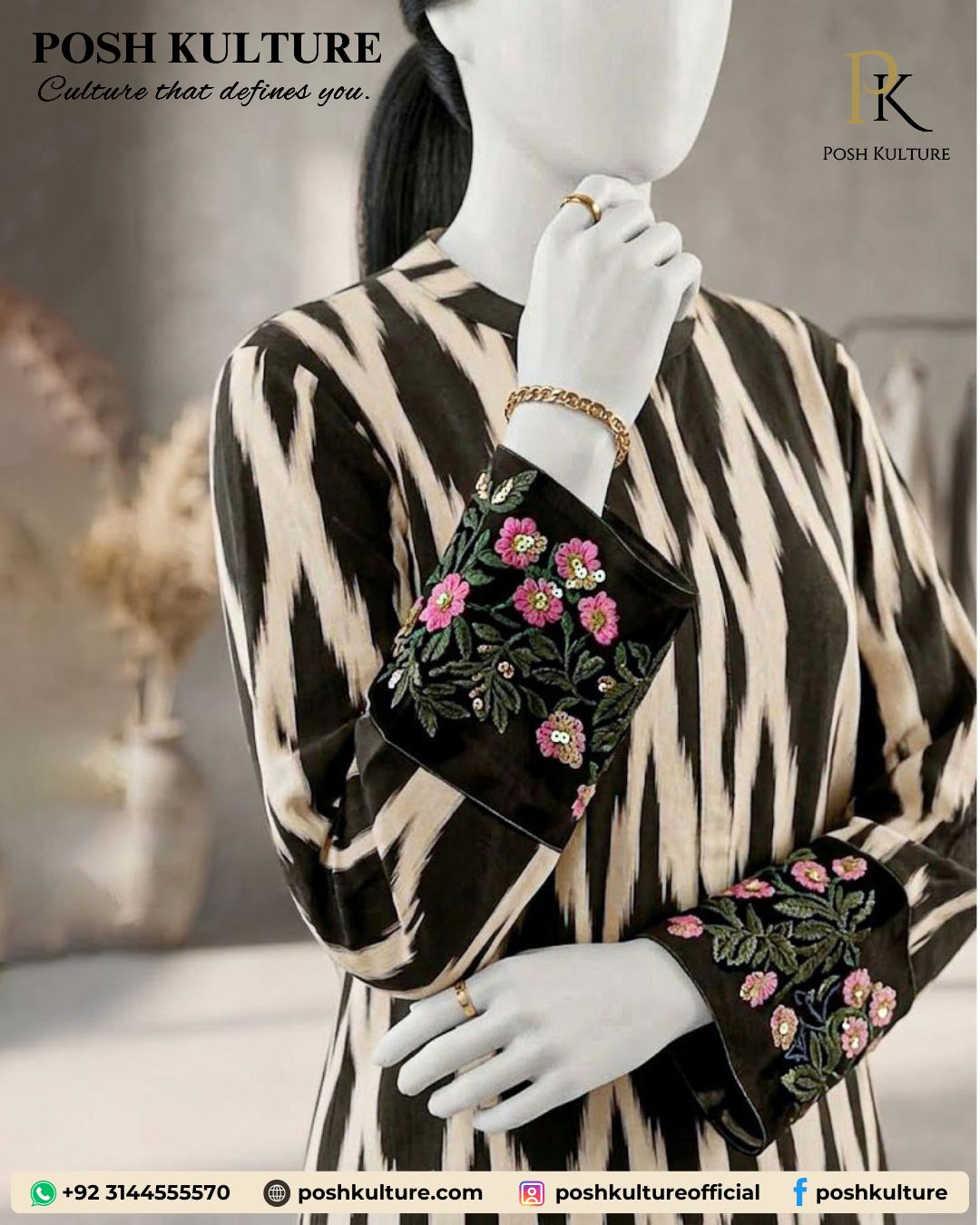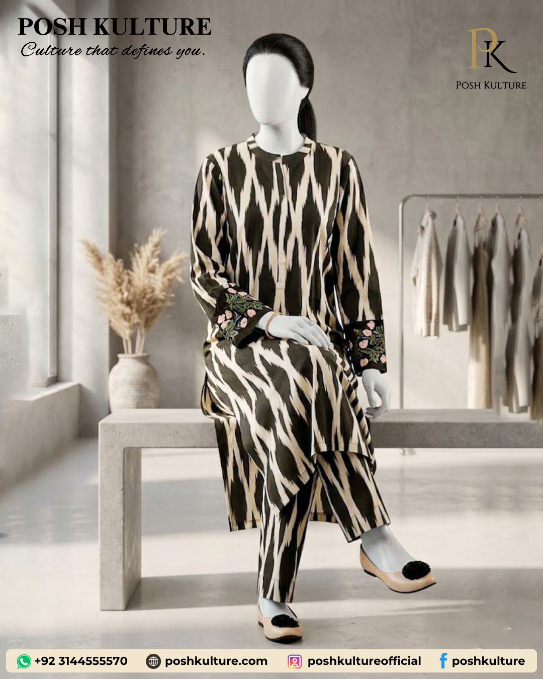 Exude modern charm with this striking Ikat-inspired unstitched 2-piece collection. Made from premium breathable lawn, this set features a bold contrast of vertical patterns and delicate floral motifs on the cuffs, perfect for a chic co-ord style. This high-quality fabric offers the versatility to stitch a look that is uniquely yours, ensuring comfort and high-fashion appeal for the warm summer days.