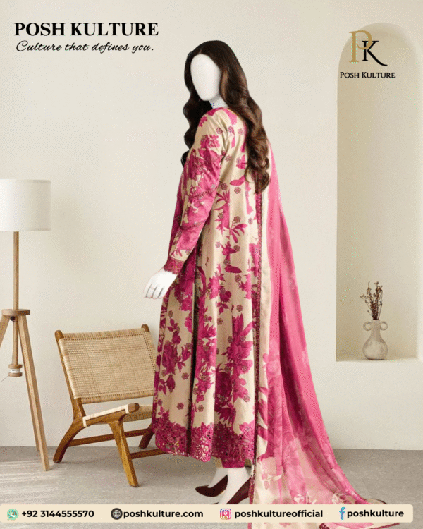 This new arrival winter collection 2025 is a 3-piece suit made from premium quality dhanak. It features a luxury digital-printed dhanak shirt and a matching luxury digital-printed dhanak shawl, complemented by plain dyed trousers. The vibrant magenta floral print on the neutral base makes for an eye-catching, festive ensemble.
