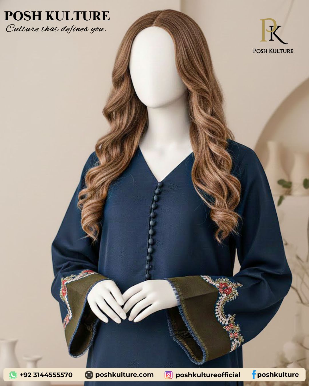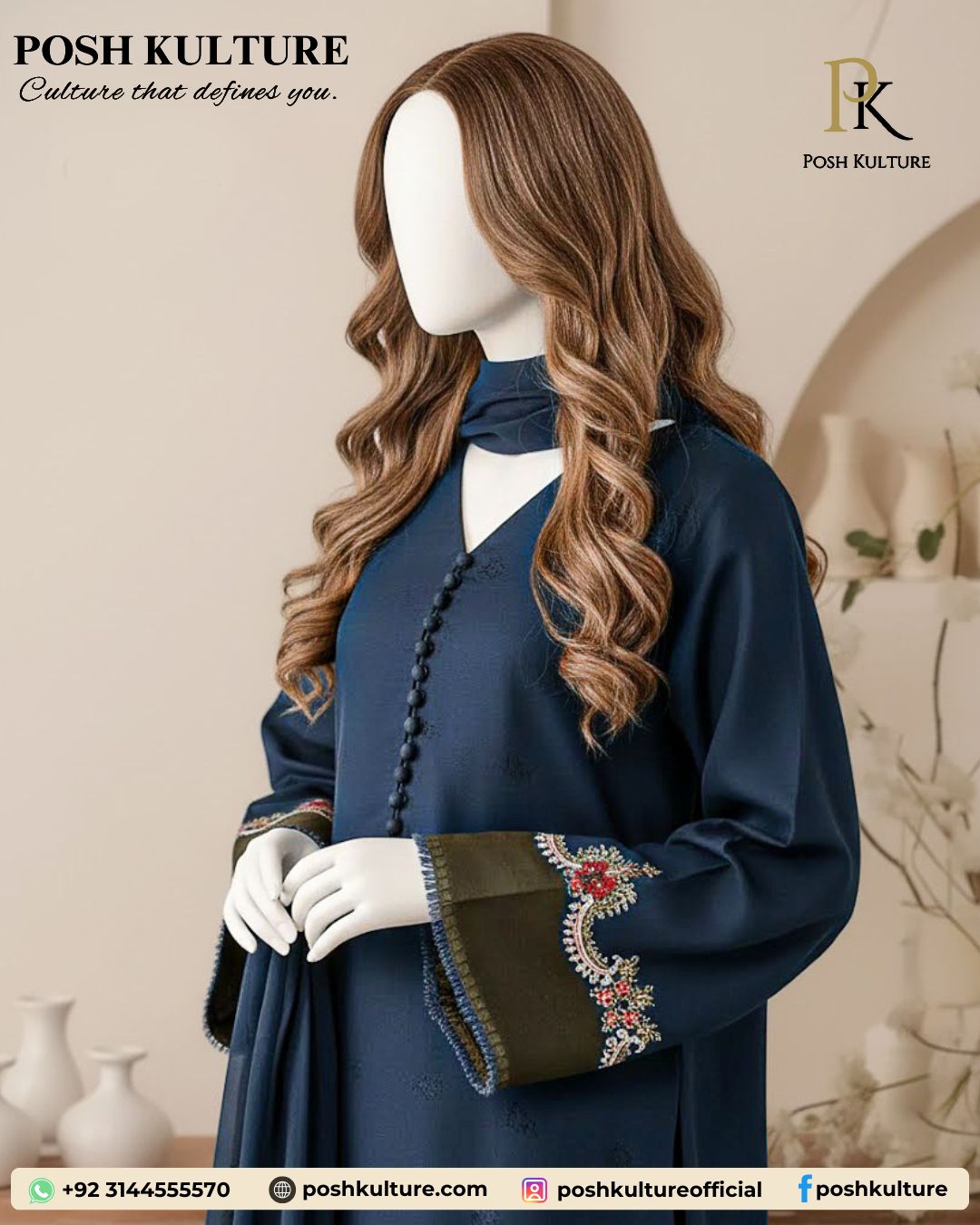 Tags: Deep Winter Suit, Floral Embroidery, Navy Blue Dhanak, Olive Accents