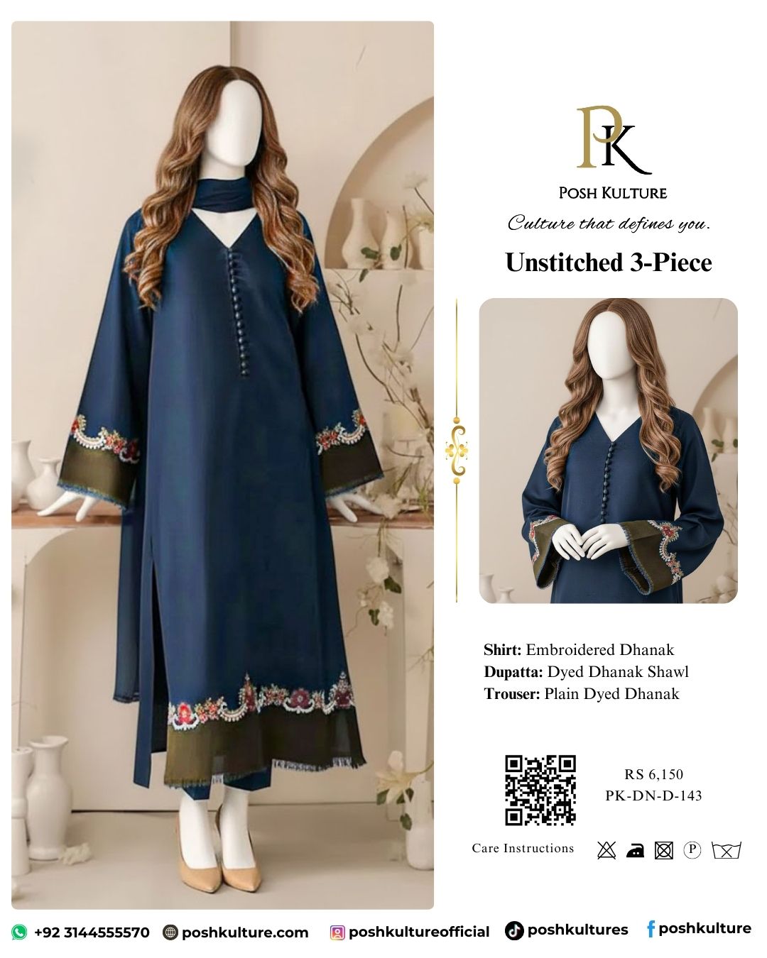 Experience deep winter luxury with this Dhanak Suit in a captivating deep navy blue. The sophisticated design features rich floral embroidery along the cuffs and hem, beautifully contrasted with subtle olive green accents. Perfect for exceptional warmth and effortless style this season.